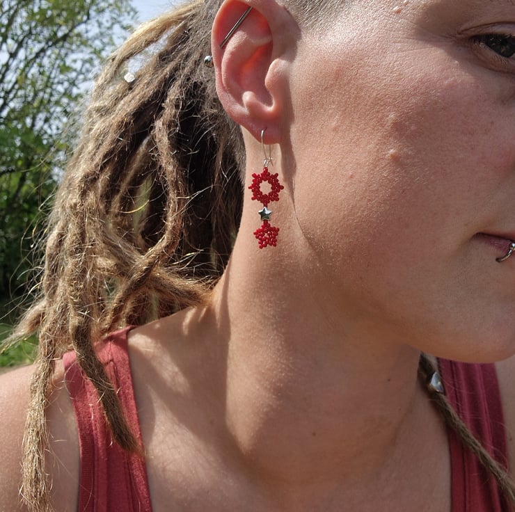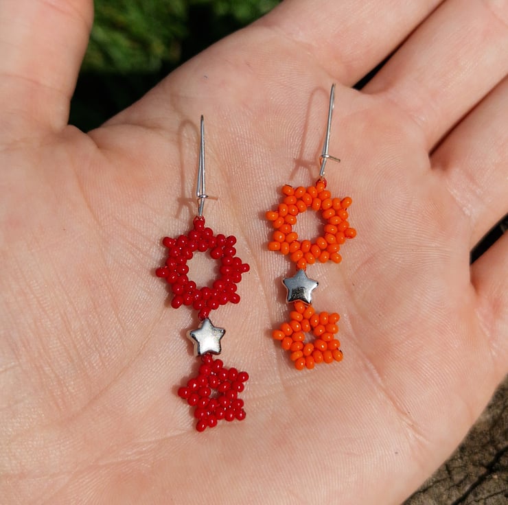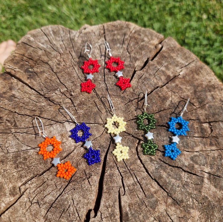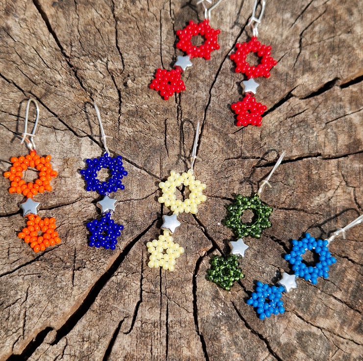 I love these 5 pointed beaded stars and wanted to combine other beads in my stash. I played around for a while then decided on creating an 8 pointed sun, jointed with the silver coloured star bead, and finished with a 5 pointed beaded star. And boom! Love them!
