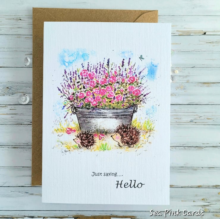 A versatile card, blank inside for writing your own personal message, making it great for all occasions. The sentiment on the front reads, just saying.... hello. The card is 10.5 x 15 cms and has been reproduced from my own original artwork. Featuring a planter of roses and lavender and two adorable hedgehogs. There is a tiny dragonfly too! This card has hand-finished details added with a water-based glimmer pen, which can be seen when the card catches the light.