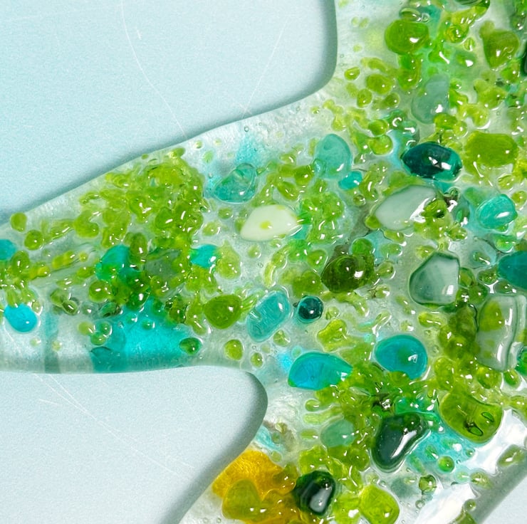 Made using pieces of glass from other projects, nothing goes to waste in my home studio. placed into a handmade mould and fired in the kiln.
