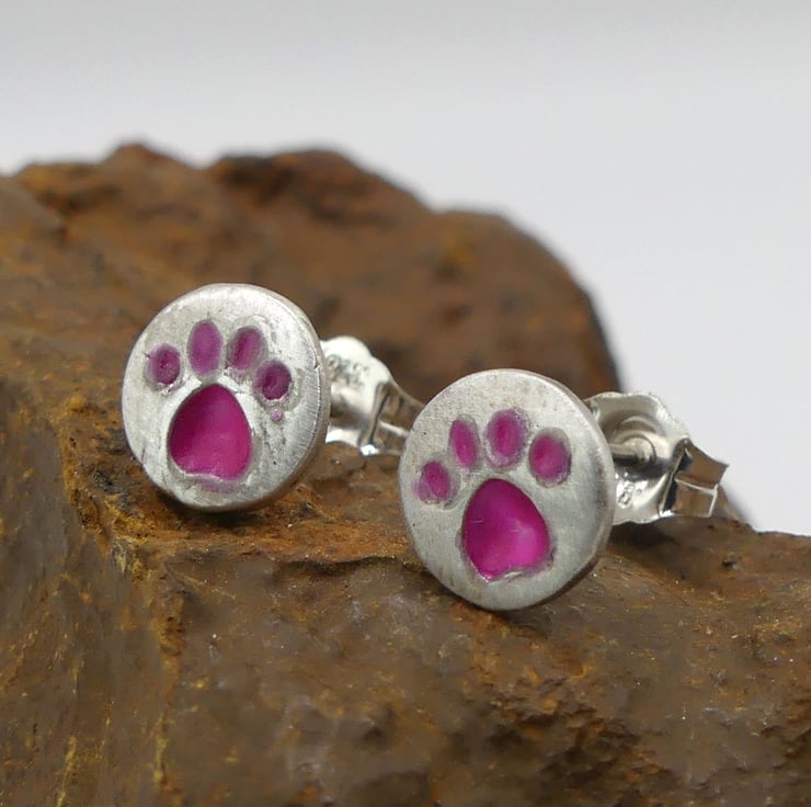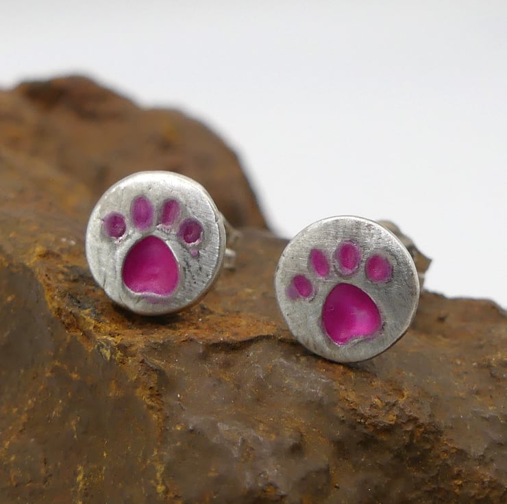 Recycled Sterling Silver Pawprint Stud Earrings with a Pink Patina.