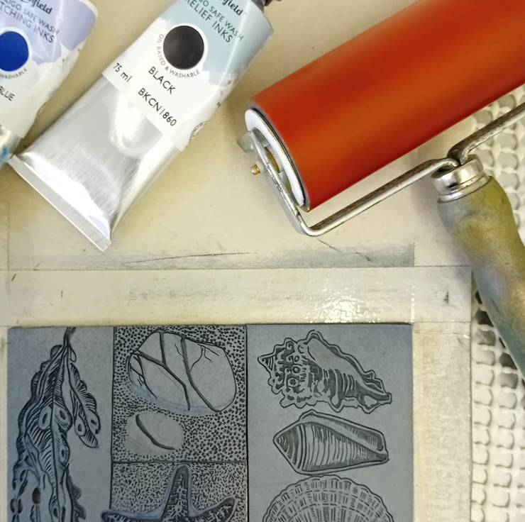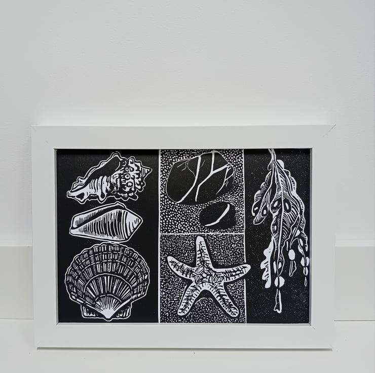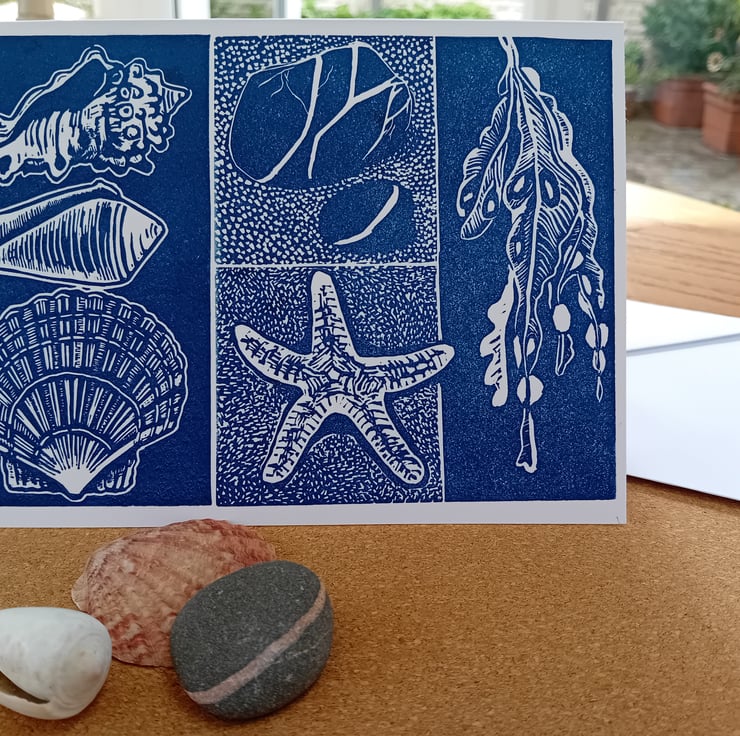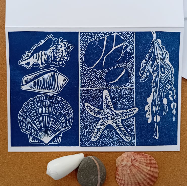 The artwork has a coastal theme and features beach finds. Shells, seaweed, pebbles and a starfish. All hand carved from my original drawings.