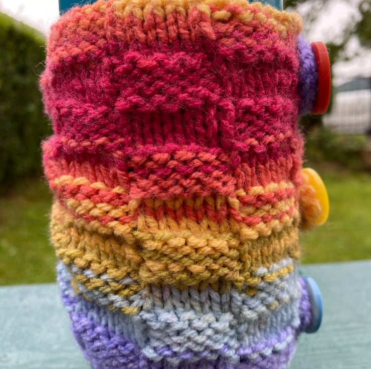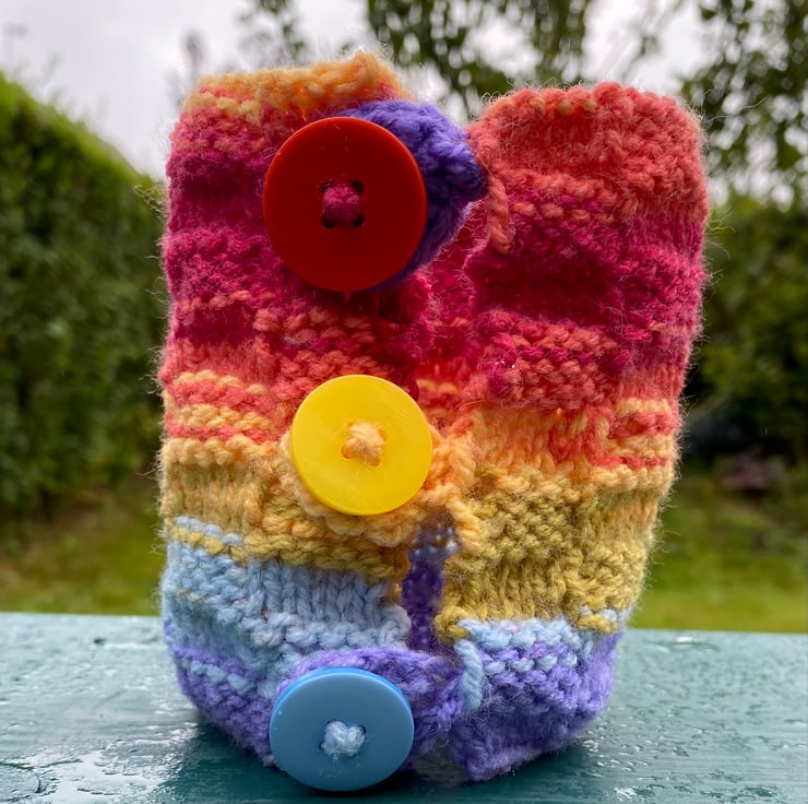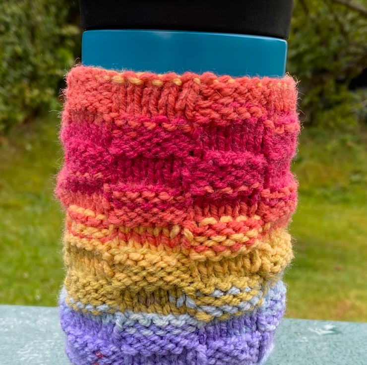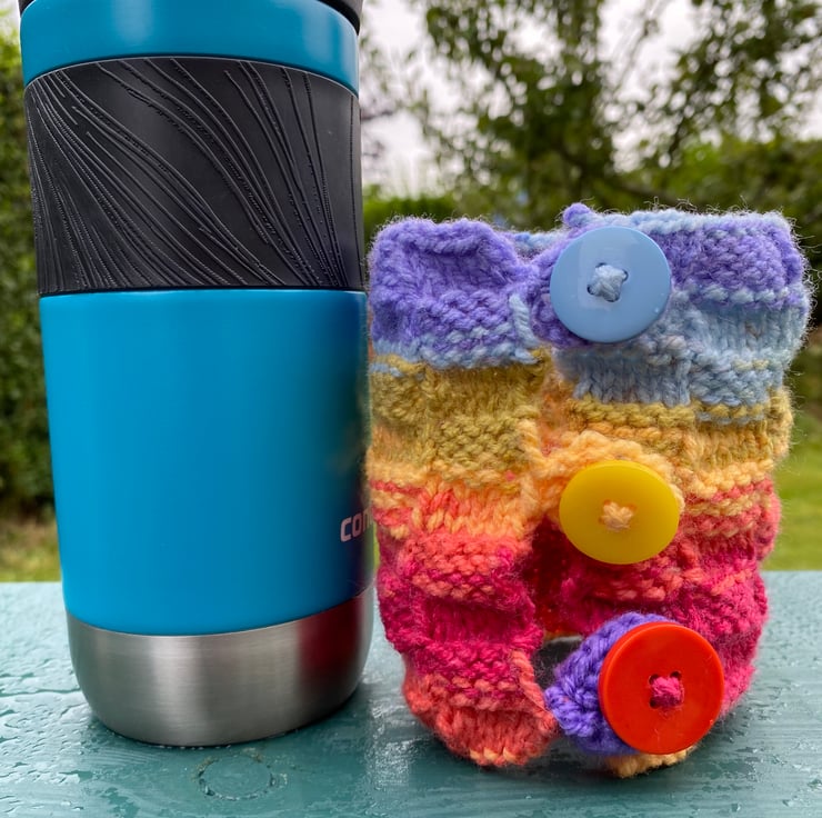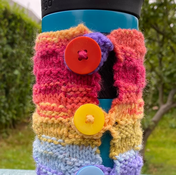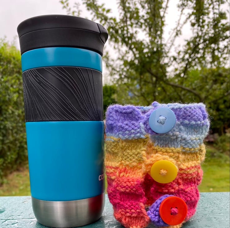 A one-of-a-kind handknitted travel mug cosie in beautiful bright colours, perfect for any tea or coffee lover on the go.