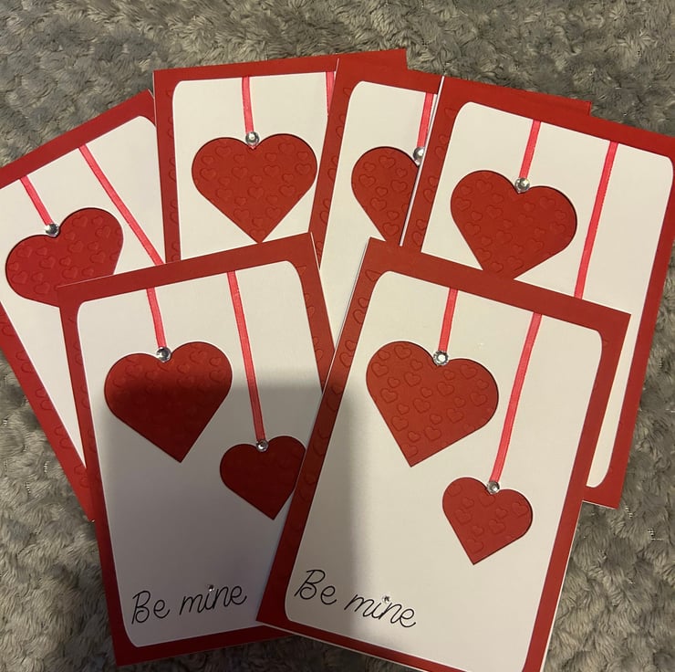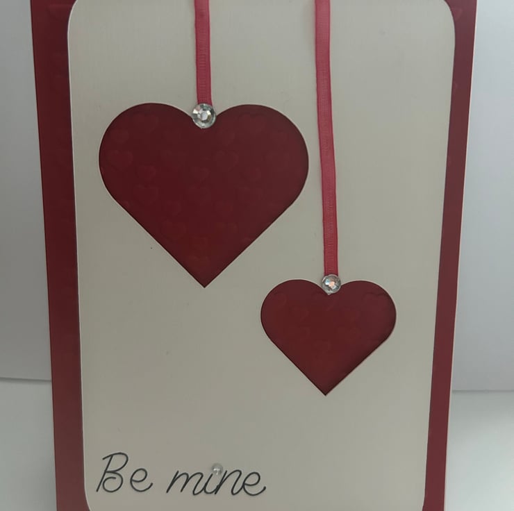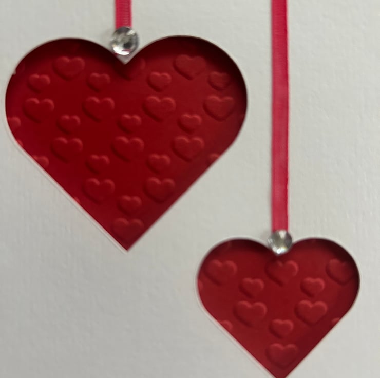 Beautifully embossed with hearts red card, ribbon, rhinestones for added sparkle.