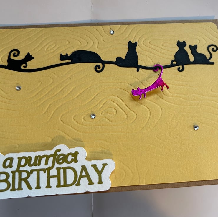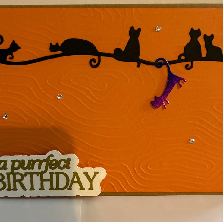 Beautiful purrffect birthday card for a cat lover, the card base is a Kraft card stock, yelloworange wood effect embossed card, a row of black cats and a purple holographic mischief making cat hanging by its tail and added rhinestones for a bit of sparkle.