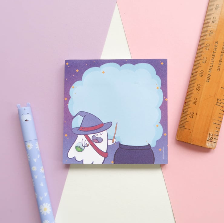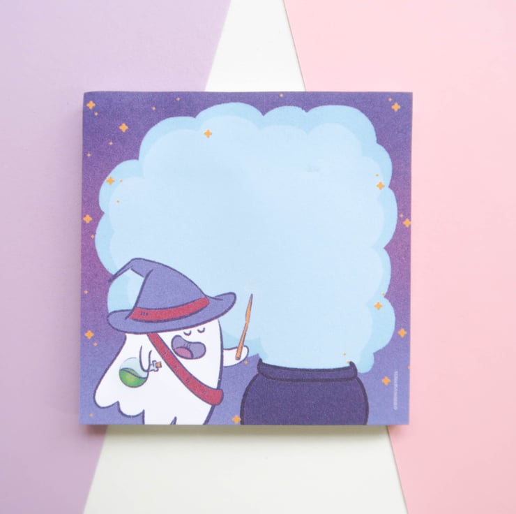 7.2cm x 7.2cm sticky note pad featuring Hex the Ghost as a wizard by a bubbling cauldron—perfect for planners, books, desks, and magical reminders!