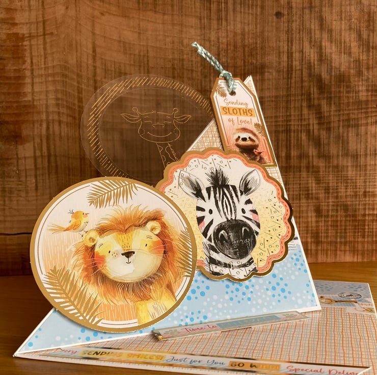 Featuring a lion, zebra, giraffe, sloth and more this uniquely crafted twisted easel card stands upright for display, making it a great card and a keepsake.