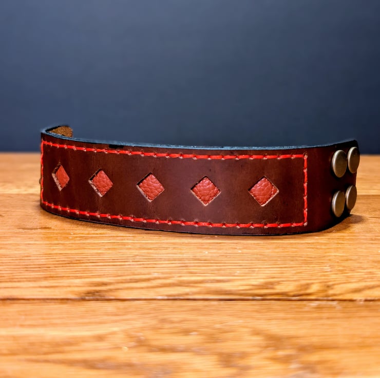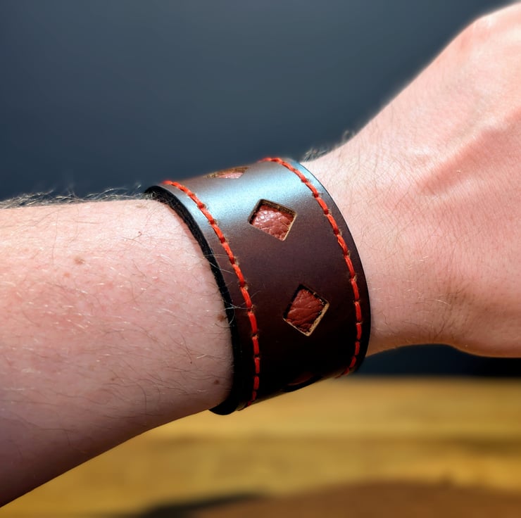 This leather cuff features a brown leather outer layer with diamond shape cut-outs revealing a second layer of soft red leather underneath. Secured with red stitching and featuring 2 sets of 2 bronze coloured snap fasteners for two size settings, this cuff is suitable for wrist sizes under 20cm.
