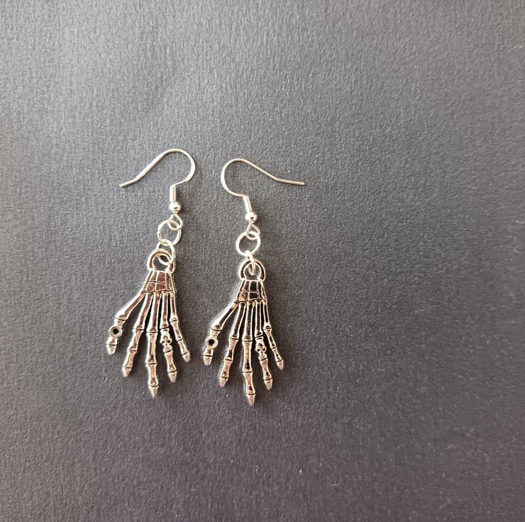 These handmade earrings are crafted using sterling silver skeleton hand charms and stainless steel hooks. Gothic, spooky, alternative style
