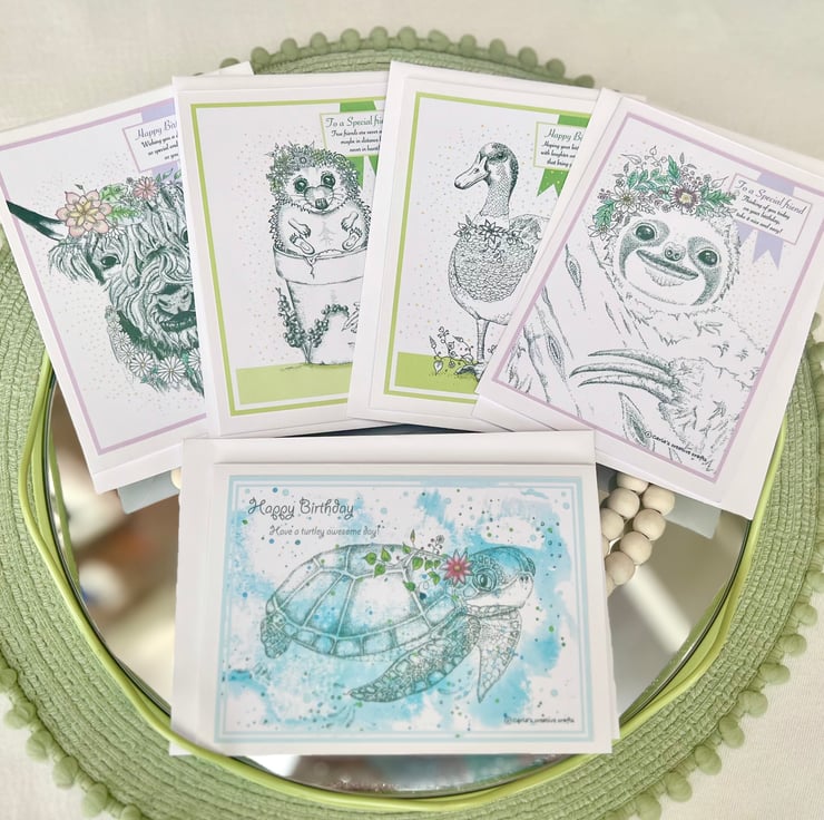 These are handmade and unique, the front cover design on every card is a colour print of my own hand drawn pen illustrations featuring animals.