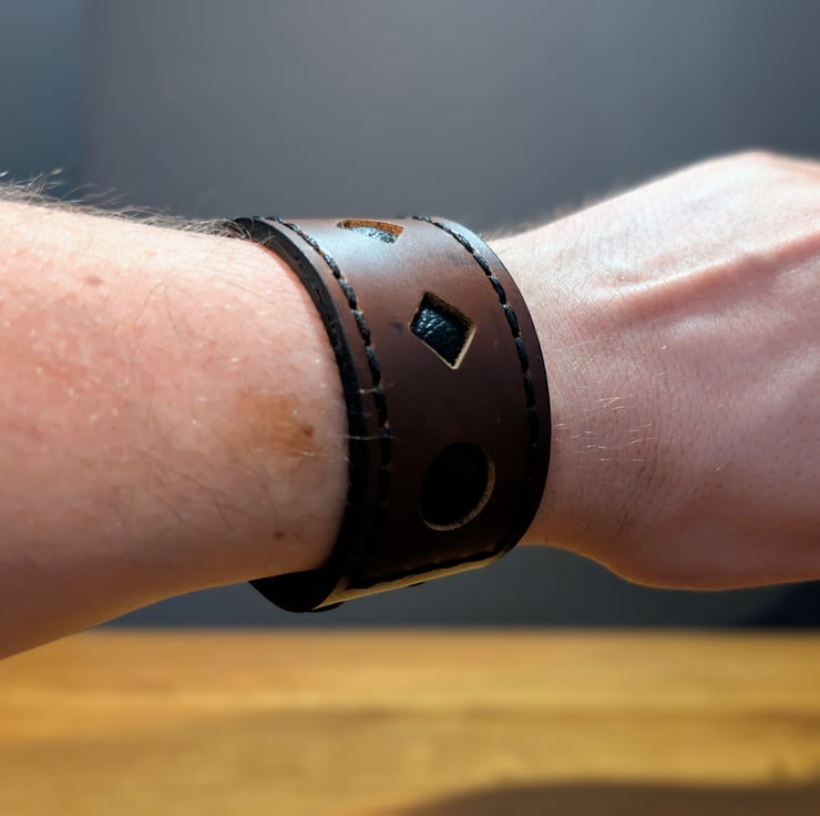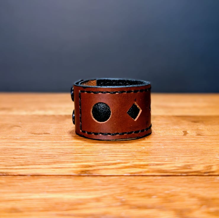 This leather cuff features a brown leather outer layer with diamond and circle shape cut-outs revealing a second layer of soft black leather underneath. Secured with black stitching and featuring 2 sets of 2 black snap fasteners for two size settings, this cuff is suitable for wrist sizes under 20cm.