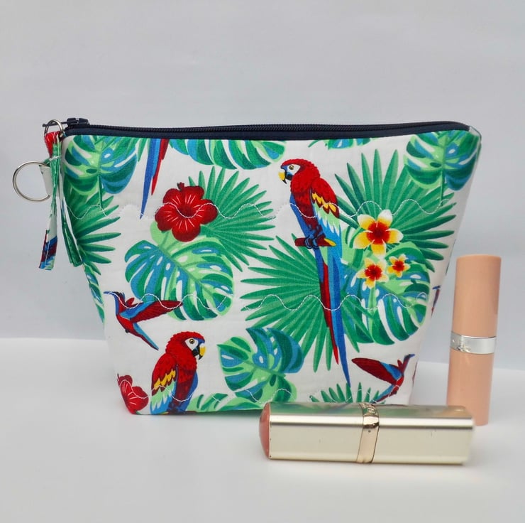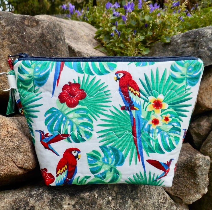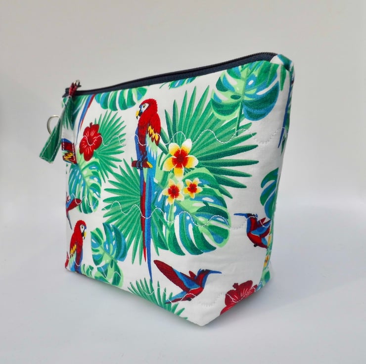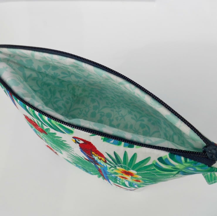 This make up bag is made with a quilting weight cotton printed with colourful parrots and tropical plants against a white background. I backed the fabric with fusible fleece to give it extra body and a quality feel and there are three lines of wave stitch on each side. It is lined with a quilting cotton which has an modern floral print in aqua on a white background.
