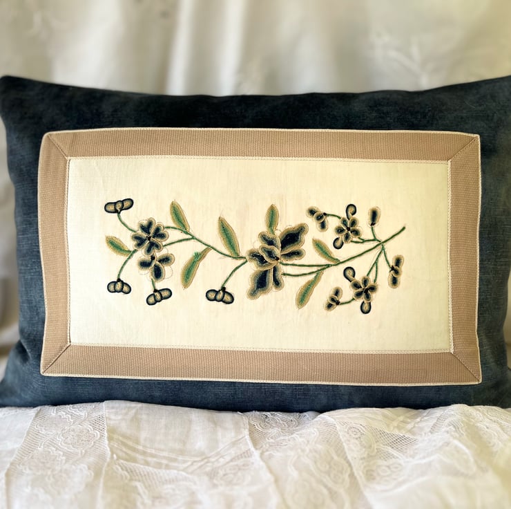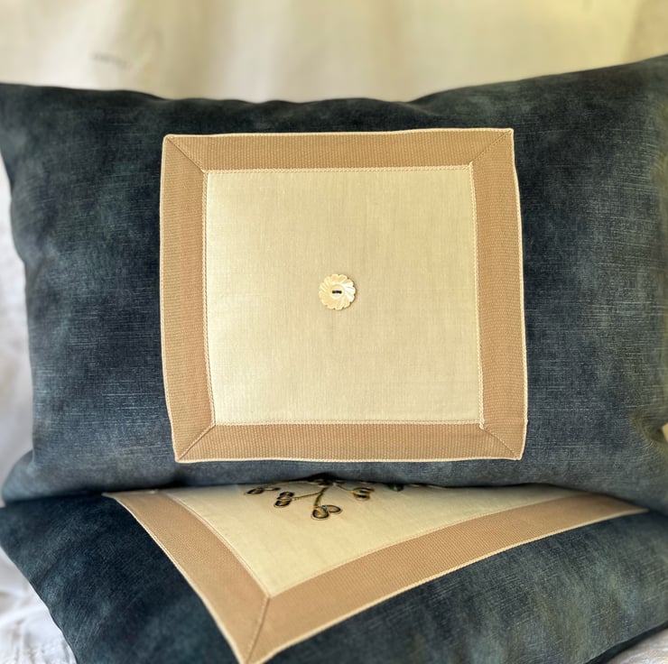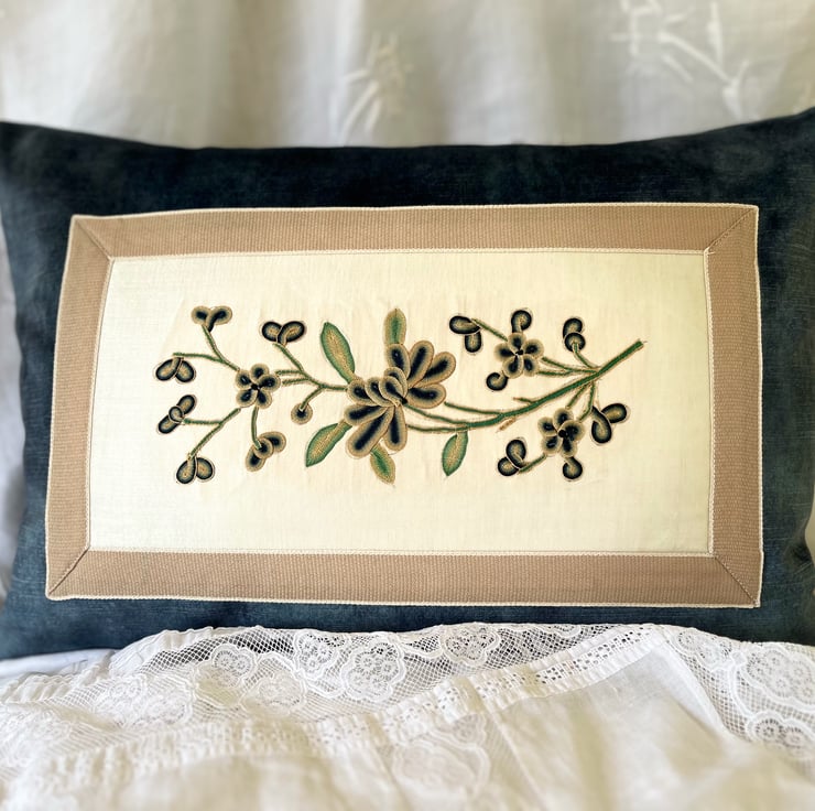 Antique Chinese hand embroidered 'couching' using graduated colours. Peonies on vanilla silk satin with latte coloured trim, set in midnight blue velvet. Double-sided with hand carved mother of pearl button on the back. With feather inserts and measuring 47 x 33 cm. There are only two available.