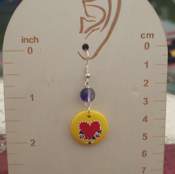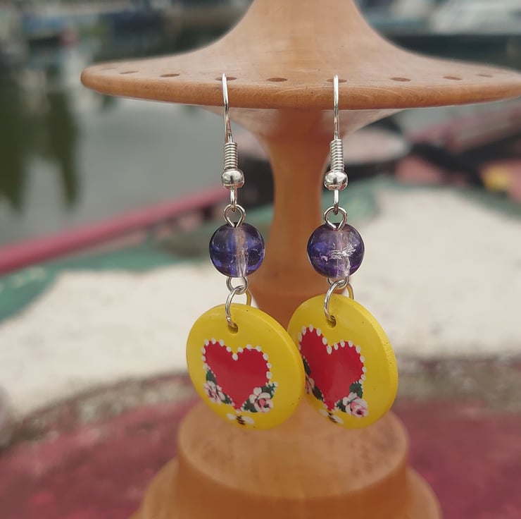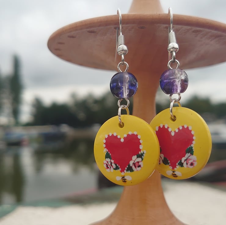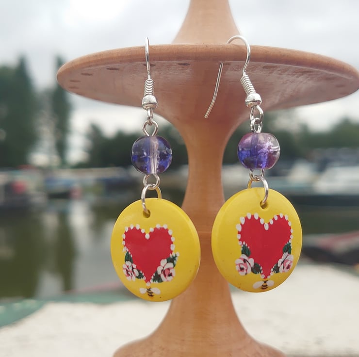 A somewhat non-traditional colour and pattern, these earrings are nonetheless rather lovely. The heart is flanked by teenytiny roses on either side in a way that's reminiscent of the roses seen on narrowboat butties.