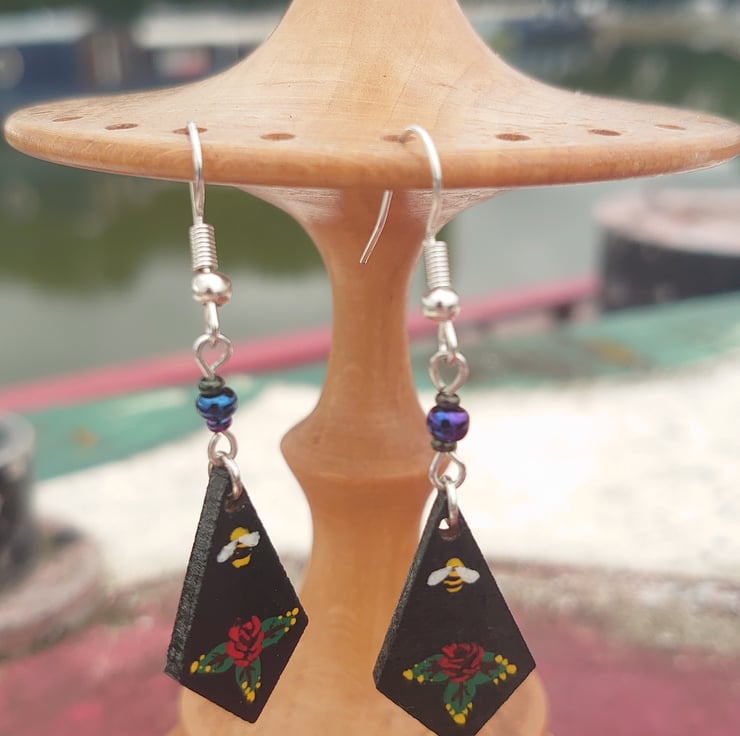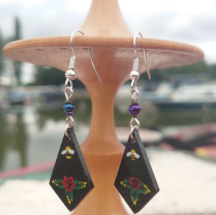 These lightweight wooden earrings are handpainted in the traditional style of the British canals.