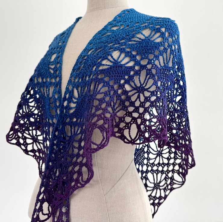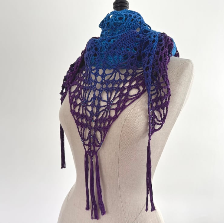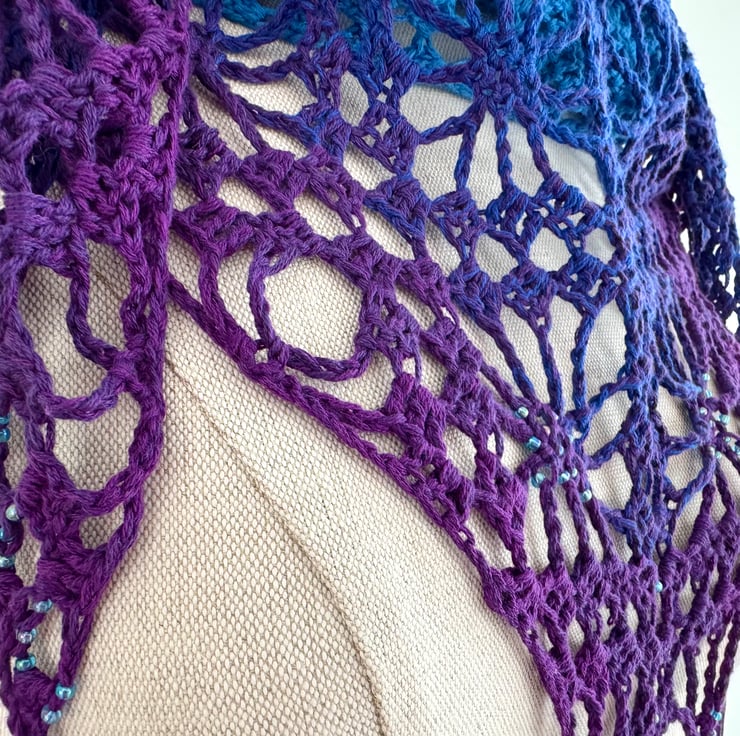 This is a handmade crochet wrap that graduates from a gorgeous vibrant turquoise blue through navy, to purple. Embellished with Toho glass beads along the outer edges, with three tassels at the centre and one either end.
