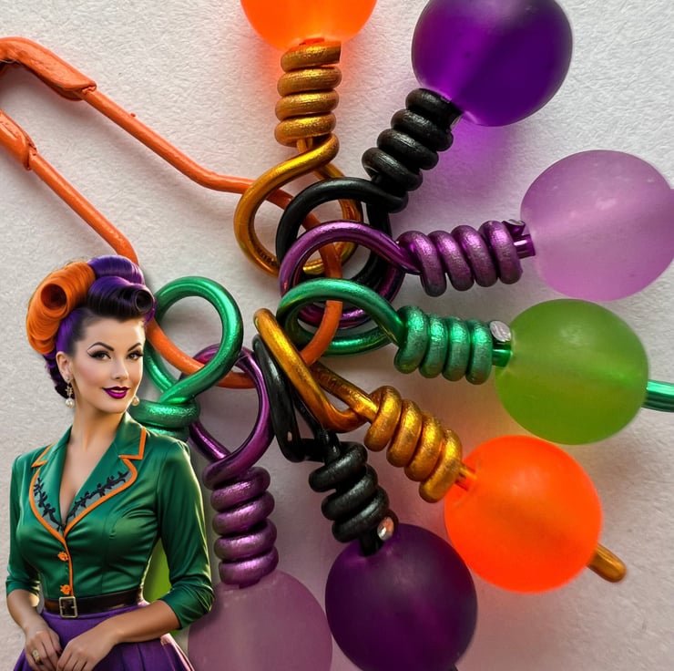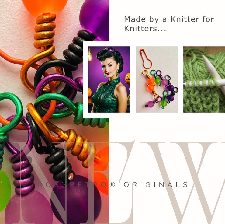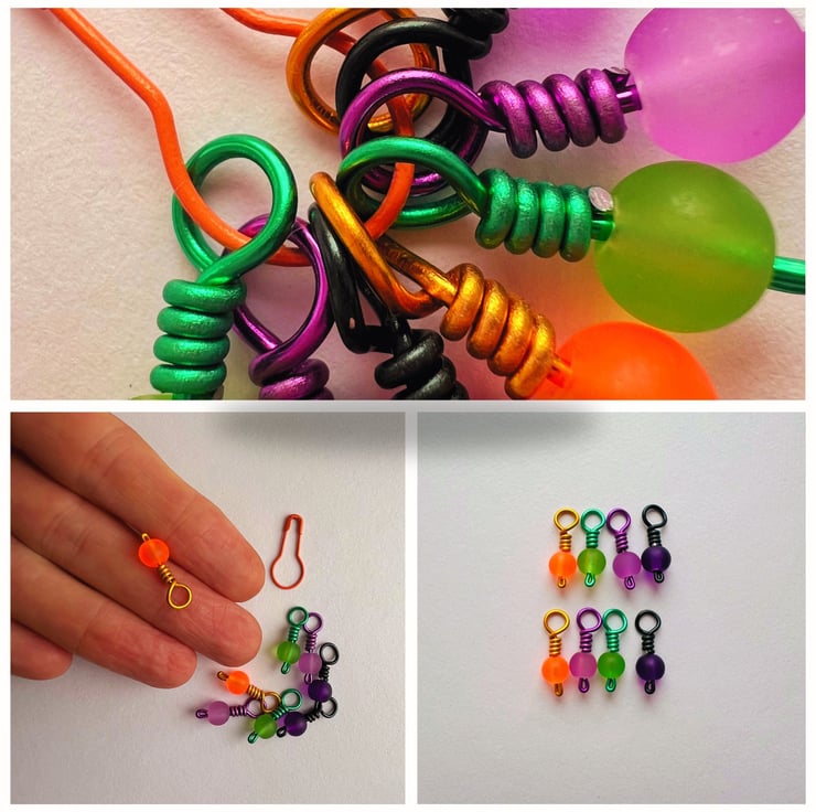 Pops of colour! Inspired by spooky season....these gorgeous little snag free wire wrapped stitch markers are perfect for marking your place in the pattern....this little set comes with a free gourd pin to keep your markers safe!