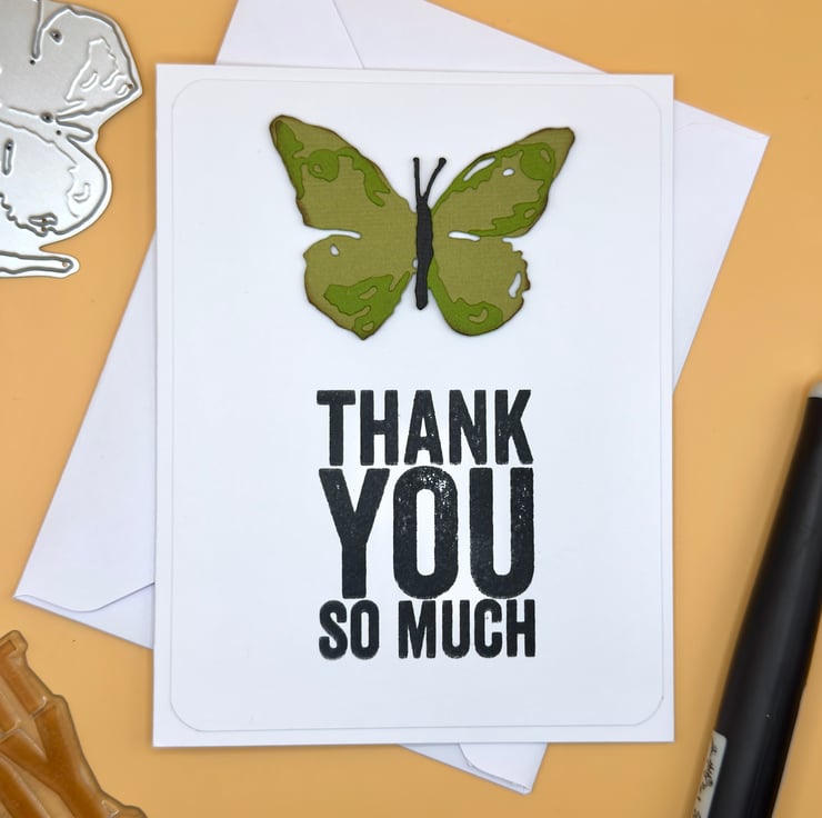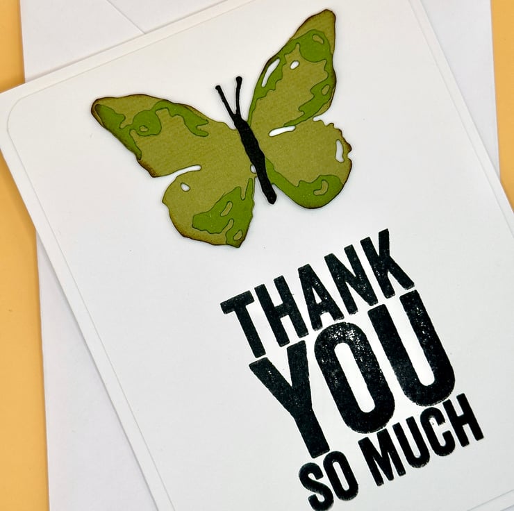 A simple, heartfelt way to say thanks. This handmade card features a layered green butterfly with lovely die-cut details, perched above the bold words “THANK YOU SO MUCH.” Clean, fresh, and nature inspired, it’s a card that works for just about any occasion when you want to show your appreciation.