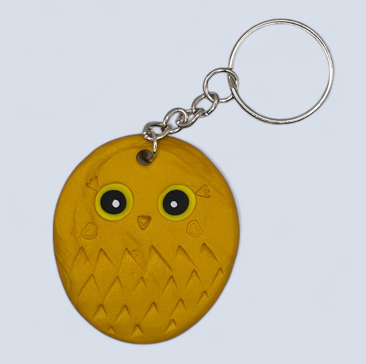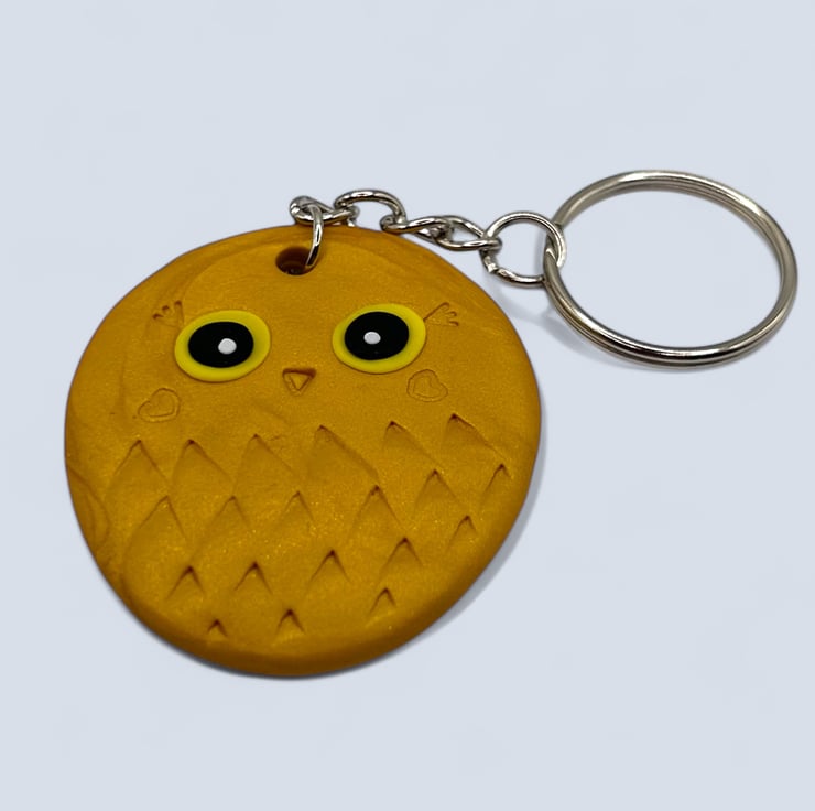 This adorable little golden owl is handcrafted from polymer clay and features my original design. It includes a chain and a sturdy split ring, making it perfect for use as a keychain or a bag charm. It would make a lovely gift for a loved one, friend, or anyone you want to let know you're thinking of them.