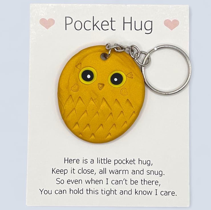 The owl is attached to a card that reads "Pocket Hug" at the top, accompanied by a poem below. It can easily be removed from the card, and the glue dot is simple to peel off. Since each owl is made by hand, no two will be exactly alike, but they will all be irresistibly cute.
