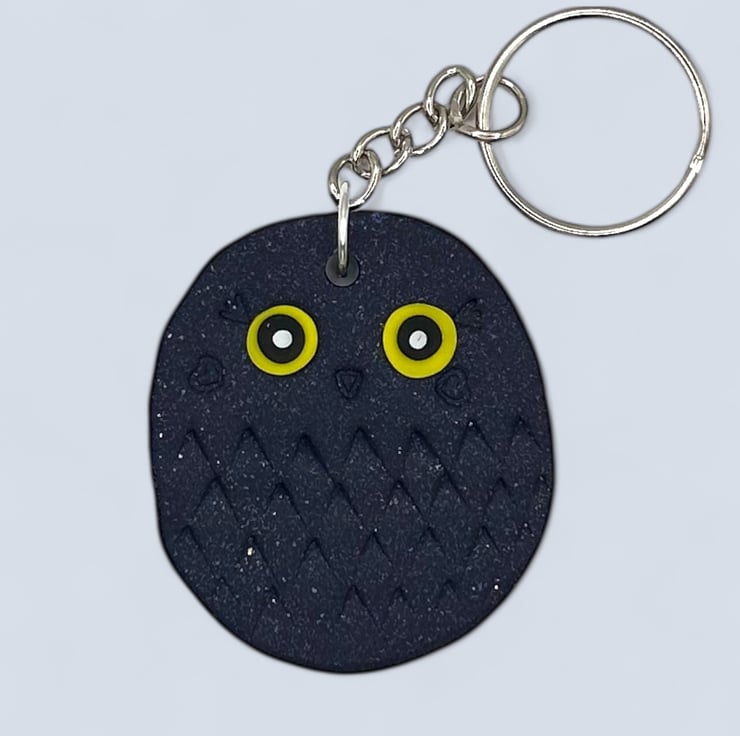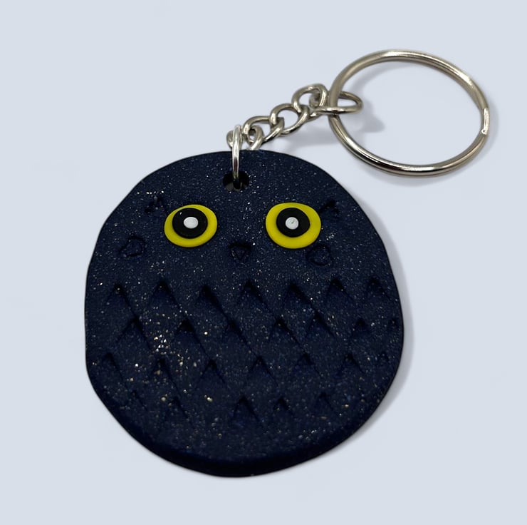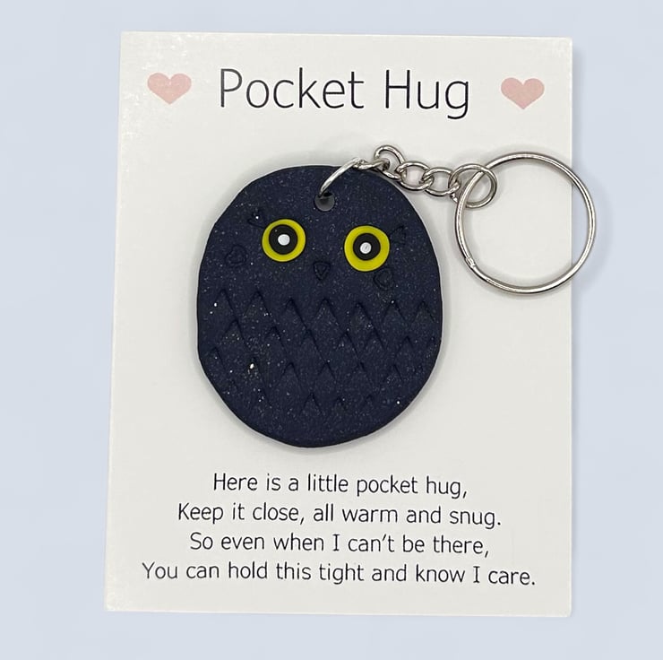 This adorable little galaxy blue glittery pocket hug owl is handcrafted from polymer clay and features my original design. It includes a chain and a sturdy split ring, making it perfect for use as a keychain or a bag charm. It would make a lovely gift for a loved one, friend, or anyone you want to let know you're thinking of them.