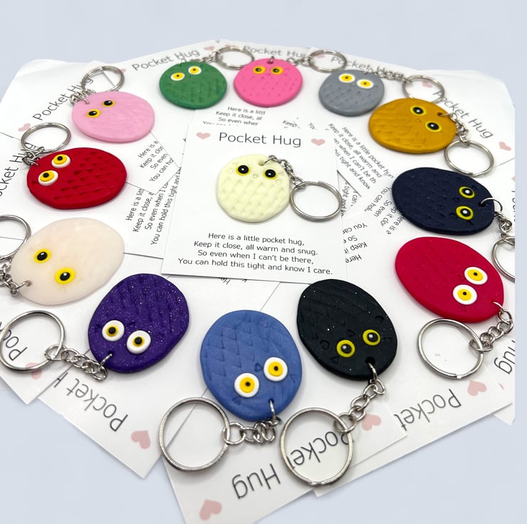 The owl is attached to a card that reads "Pocket Hug" at the top, accompanied by a poem below. It can be removed from the card, and the glue dot can be peeled off easily. Since each owl is made by hand, no two will be exactly alike, but they will all be irresistibly cute.