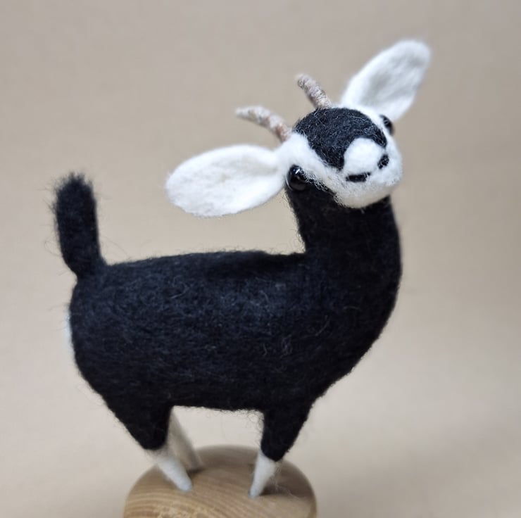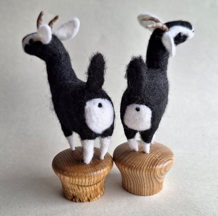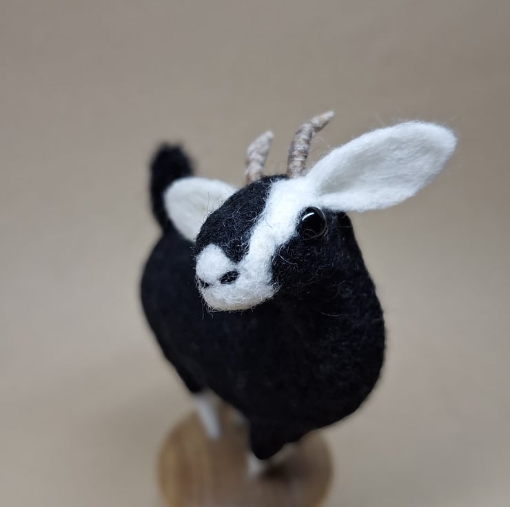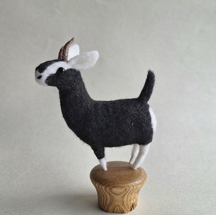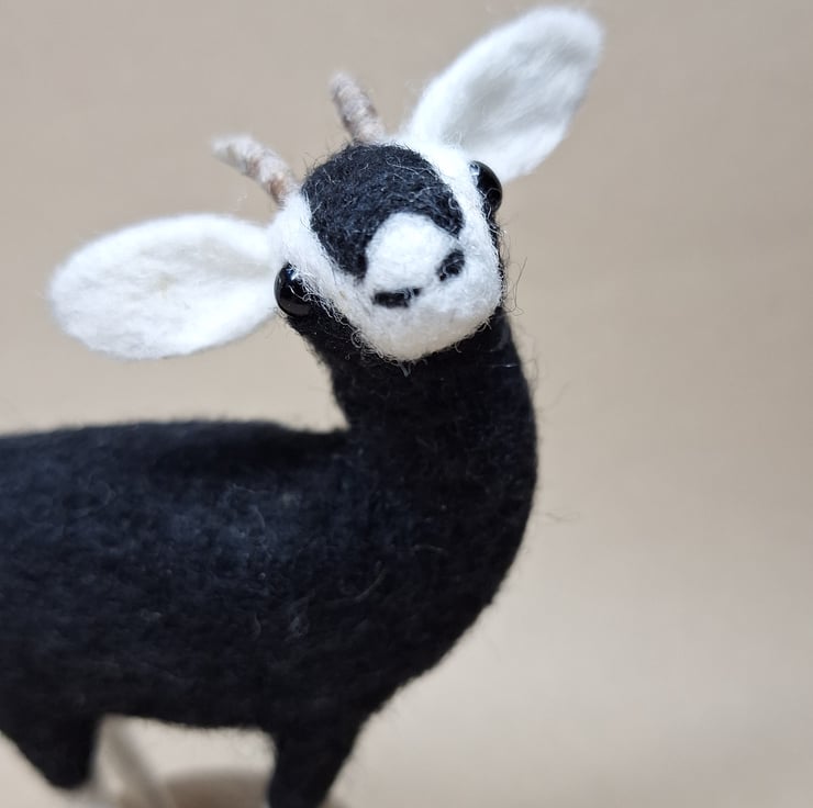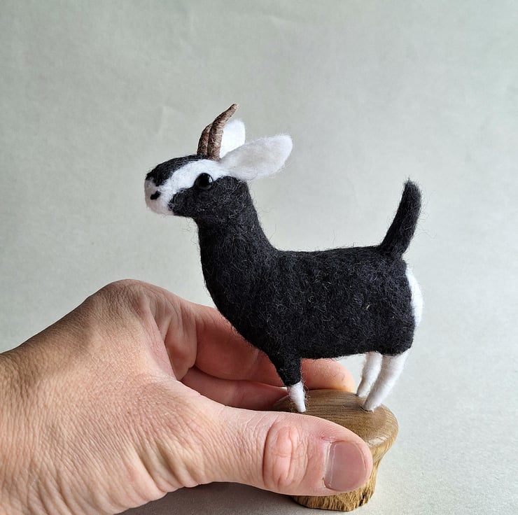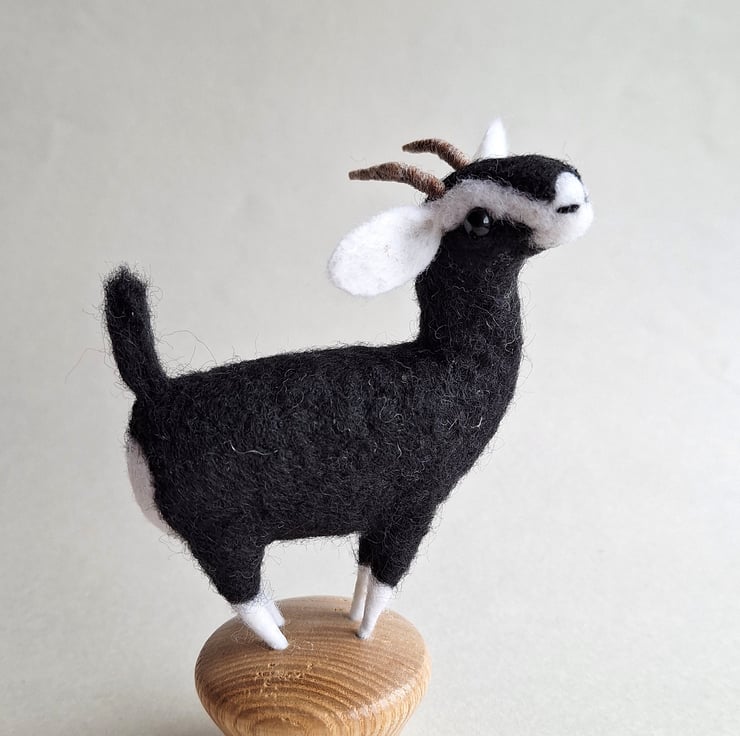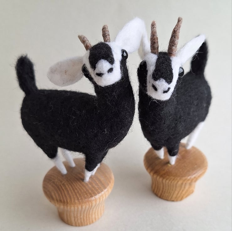 These wee Goats are made with soft carded wool, and each has tiny black glass eyes, horns and a cheeky expression! Every Goat is handmade, so each will be a little different from the last, but just as cute.