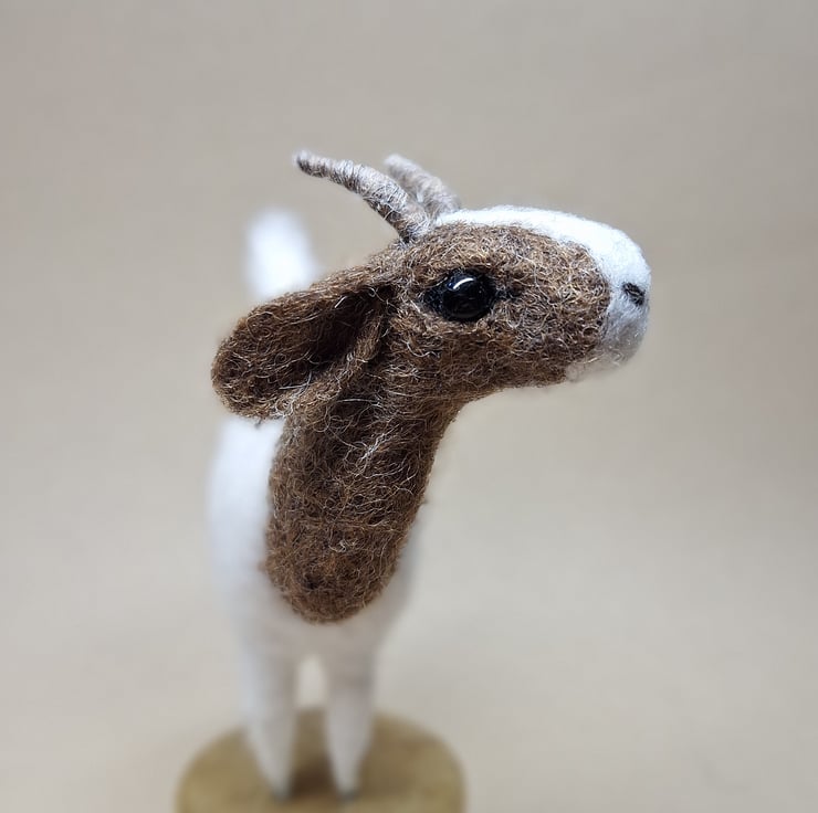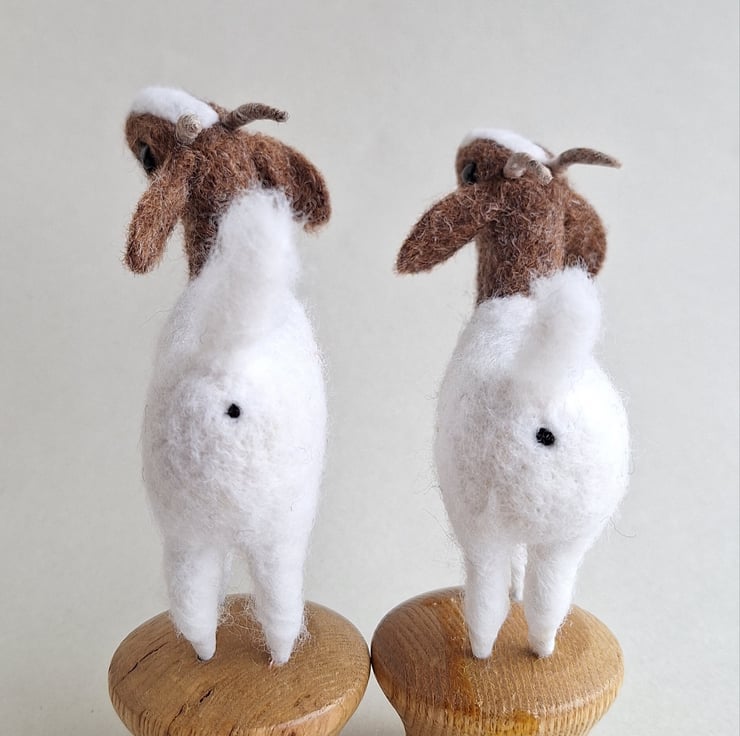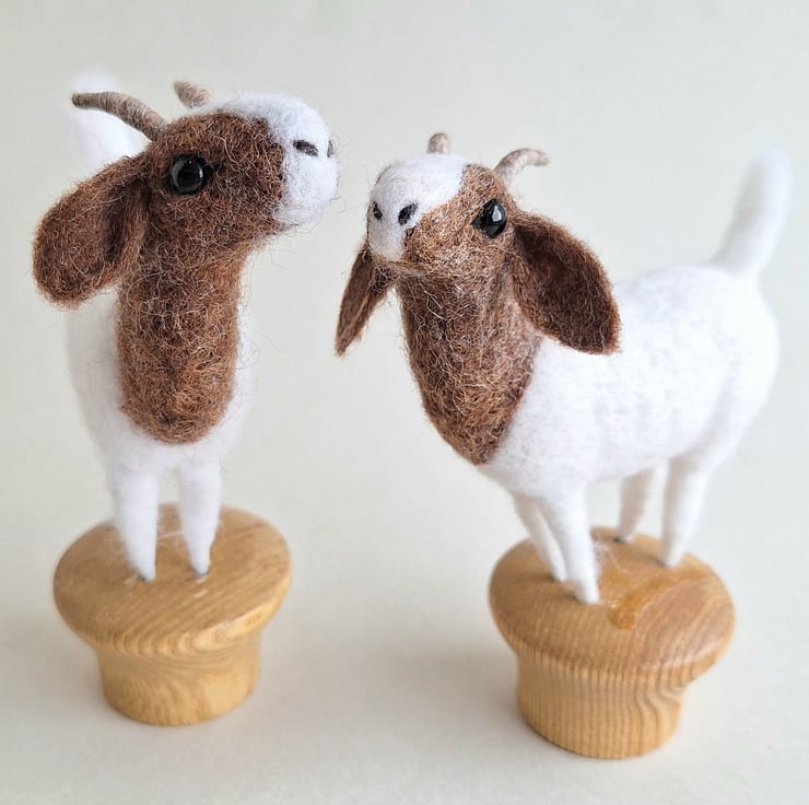 These wee Goats are made with soft carded wool, and each has tiny black glass eyes, horns and a cheeky expression! Every Goat is handmade, so each will be a little different from the last, but just as cute.