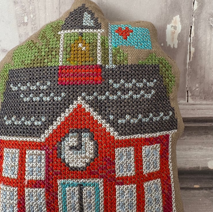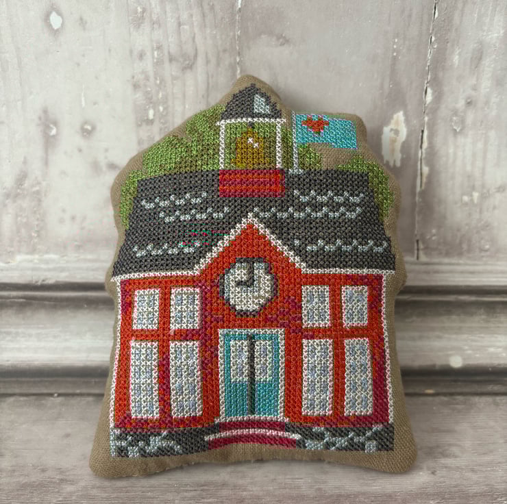 Bowl Fillers machine embroidered cross stitch design. Measuring 4” x 5.5”. Camel pre washed linen fabric filled with polyester fibrefill. Little pillows of fun. This design represents a School House. Select 1 or fill a bowl full of Autumn colours.