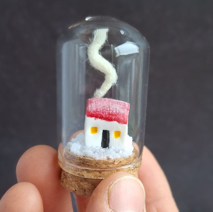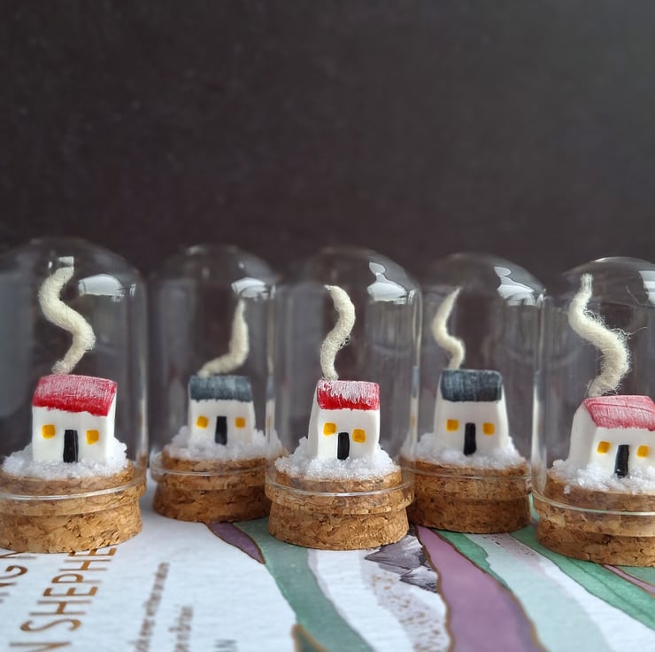 These tiny Bothies are nestled in tiny glass cloche jars. Each Bothy is hand sculpted and painted, with a wisp of woolly chimney smoke, and a felted green base.