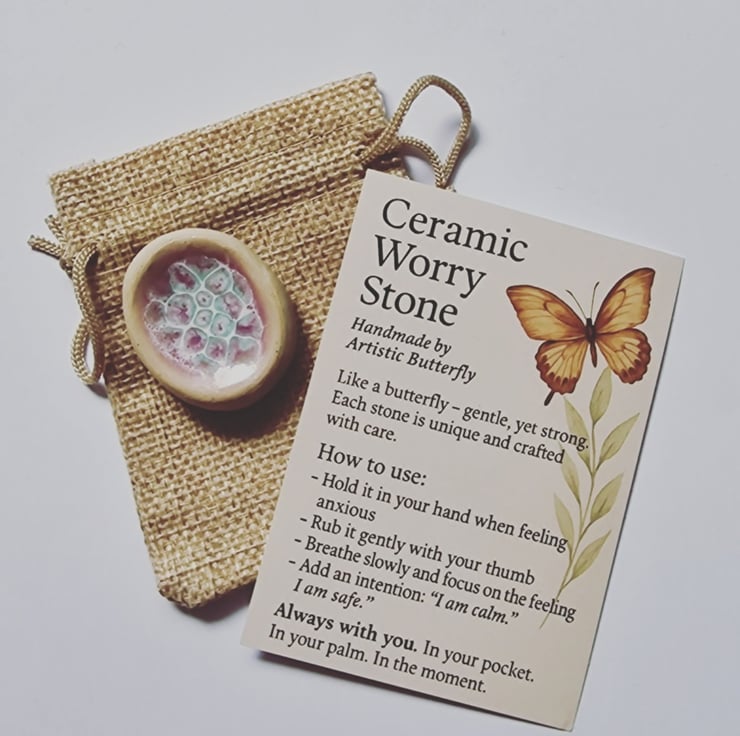 Each of my ceramic worry stones is lovingly handmade in my small studio in the UK. I put my heart into every step - from shaping the clay to adding the final glaze - so each stone is a little work of art in itself.