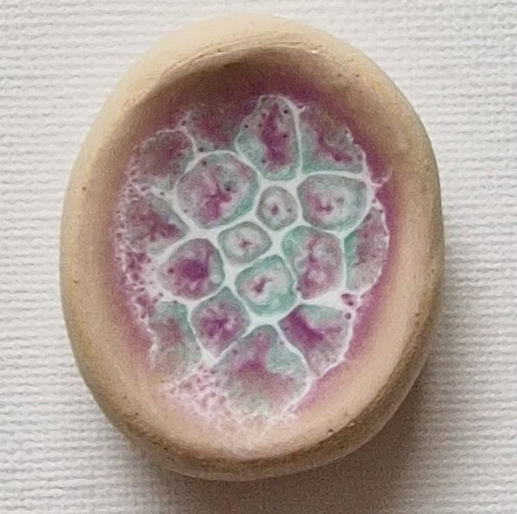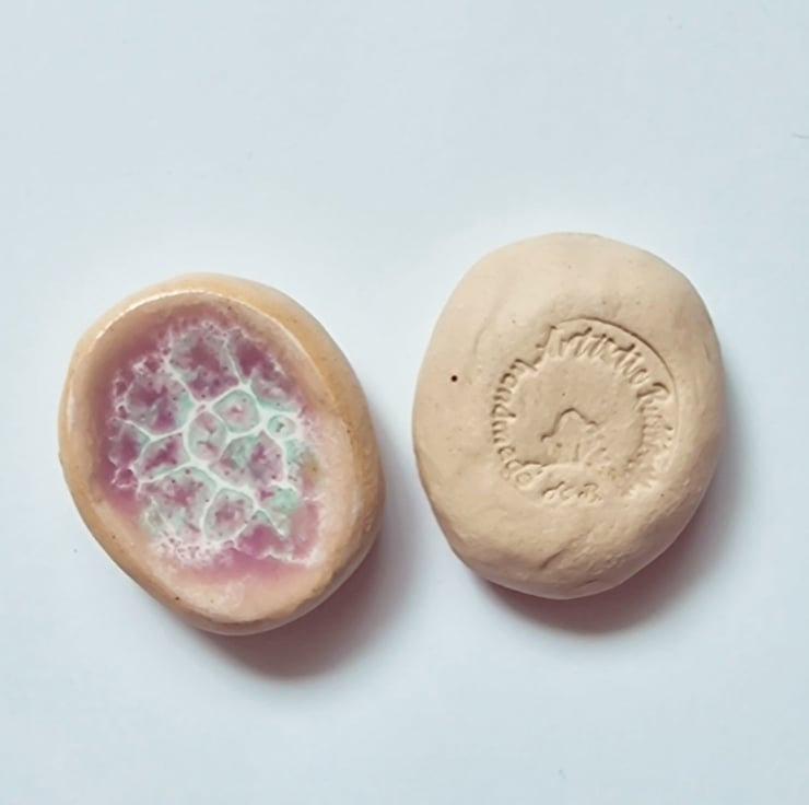 These stones are made from stoneware clay and feature a unique, glossy centre with soft pink, white and green tones, reminiscent of delicate flower petals. The back is left unglazed for a natural feel and is stamped with my butterfly logo - a symbol of calm, healing and transformation.