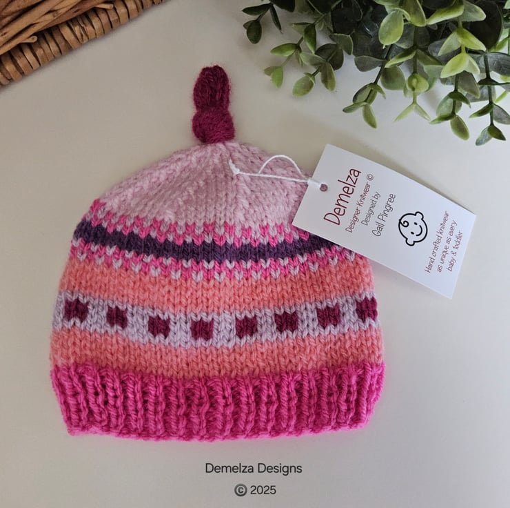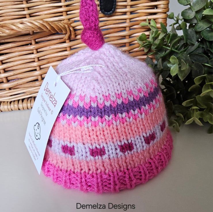 A unique eye catching newborn baby girl's knotted pixie hat designed and lovingly hand crafted in Cornwall. The yarns used are premium machine washable acrylic. This adorable little hat will make a perfect token newborn gift for any mother and baby to receive.