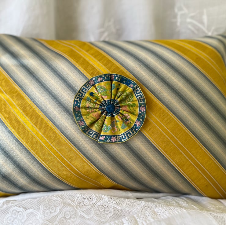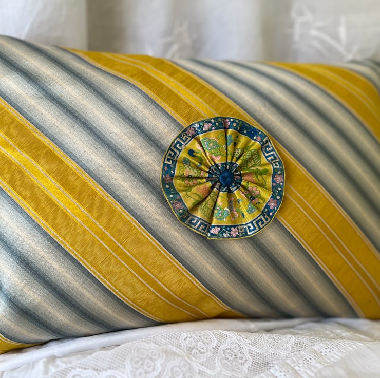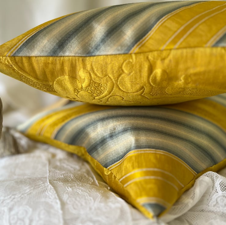 Early 18th century French ombree imberline silk with lustrous stripes, backed with early Italian damask silk. Finished with handmade rosettes of Chinese ribbon panels, and a central blue silk button. Silver tassels to all corners. Feather inserts, and measuring 45 x 32 cm. Only two available.