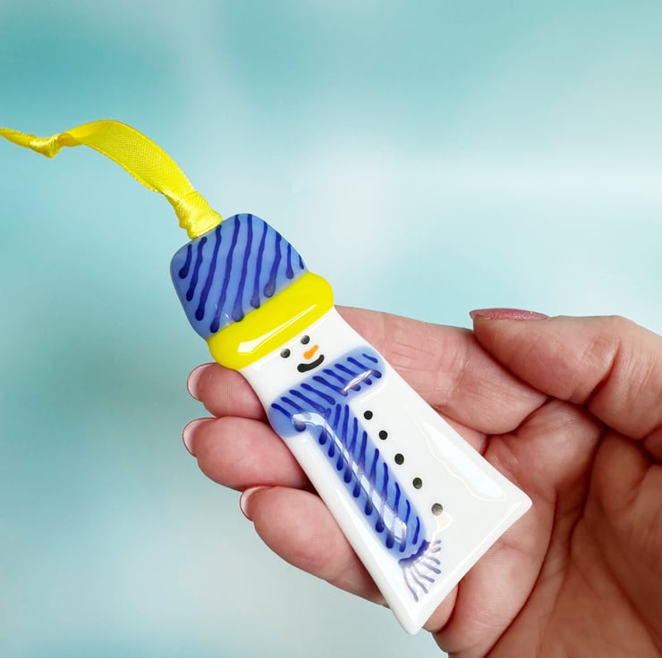 Similar to our pink attired snowman, this one is decked out in a beautiful shade of periwinkle blue with dark blue stripes on his hat and scarf which is trimmed with bright yellow.