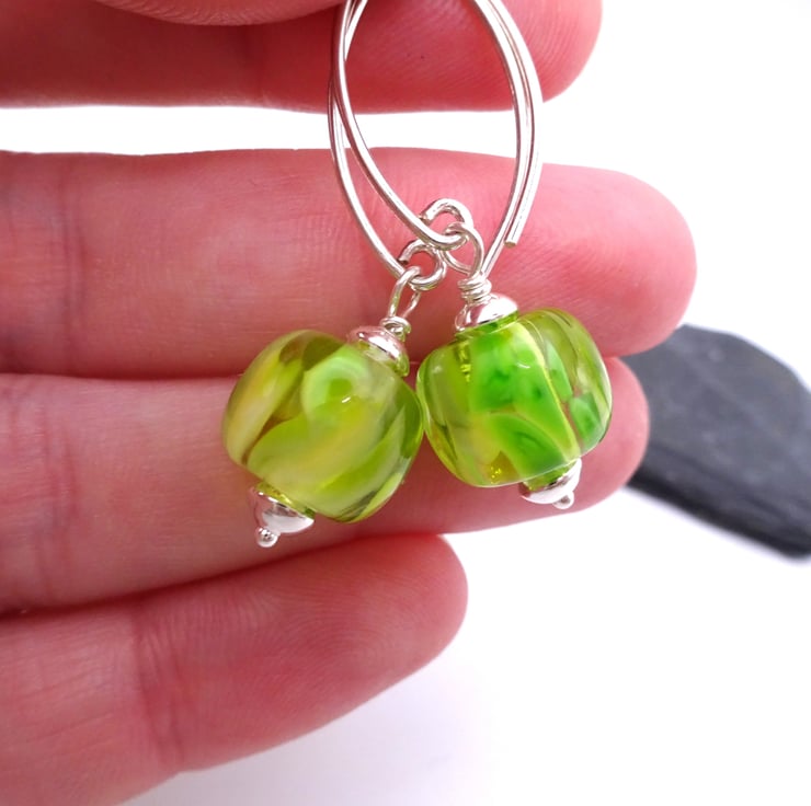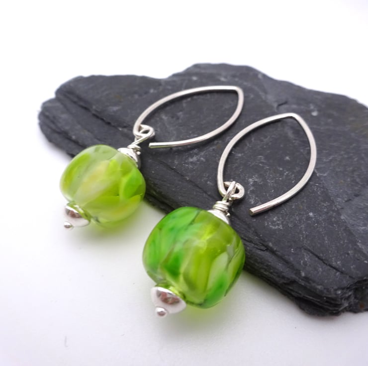 A pair of sterling silver earrings which feature green speckled handmade lampwork glass beads.