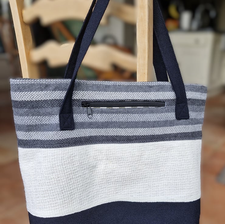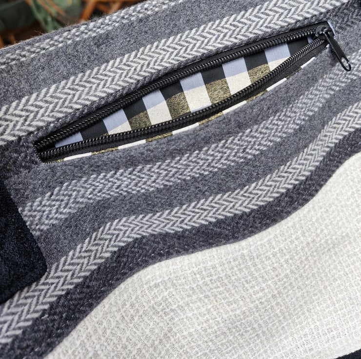 It is made from a wool mix grey striped fabric, a winter white textured stripe fabric and a textured black fabric.