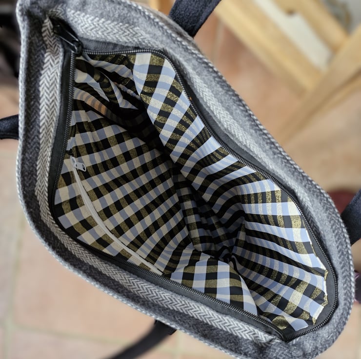 The lining is made from a checked synthetic taffeta in monochrome colours, one check has some gold metallic thread running through it.