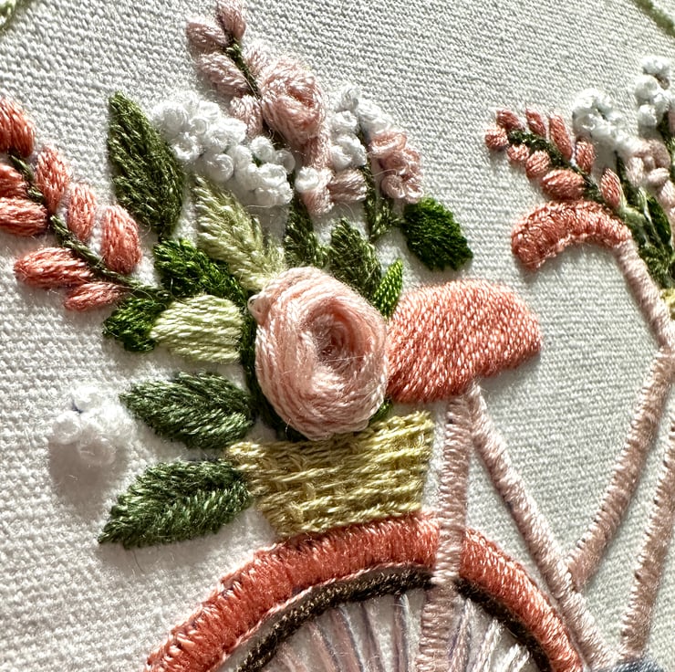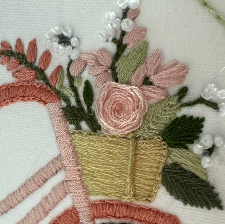 See the flowers filling the baskets, lovingly sewn in different stitches to give depth and texture to the picture.