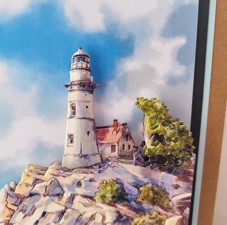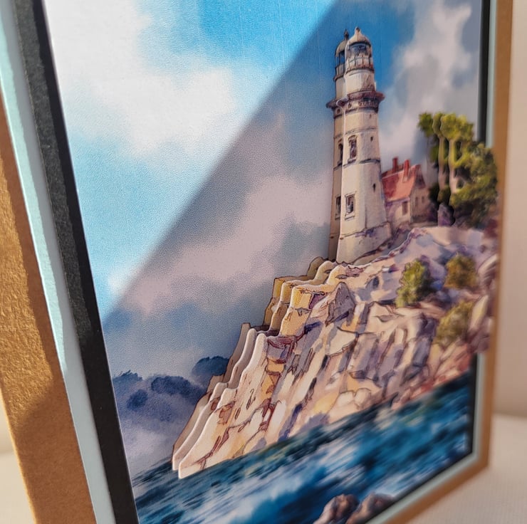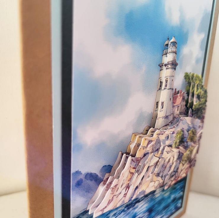 6.5 x 5 inch card (approx) I have printed the image onto good quality pro print card and die cut the lighthouse out a few times and layered them up using foam tape. I then used a blue matt then a black matt on kraft card. The card almost looks 3d.