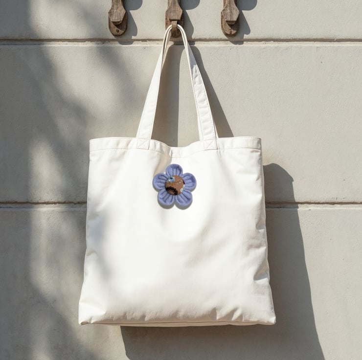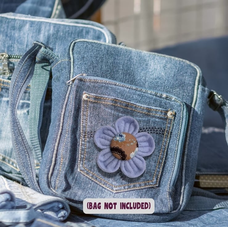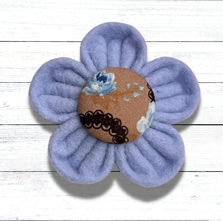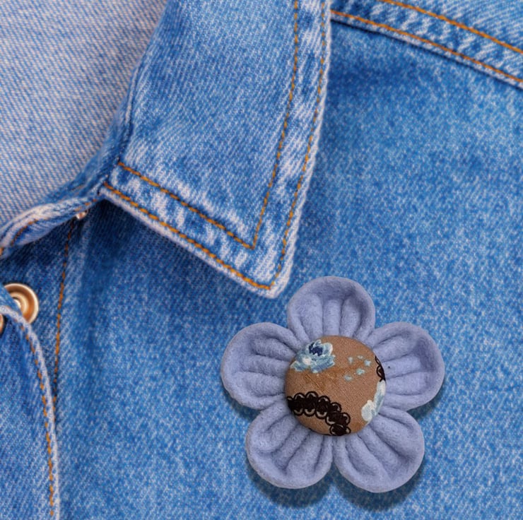 - Colour: pale blue felt petals with light brown and blue floral print fabric covered button centre