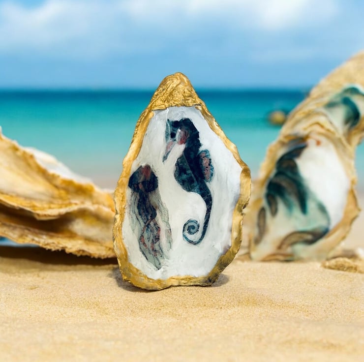 These Pembrokeshire Oyster Shells have been cleaned, painted and decoupaged with a seahorse and jellyfish. I have used quality gold metallic paint to give them the perfect finish. Once this process is finished and the shell is completely dry I have applied resin to the inner shell which gives a beautiful shine. Perfect for your rings or trinkets in the bathroom. Your shell will be securely packaged in a gift box and despatched to start its new journey in life.