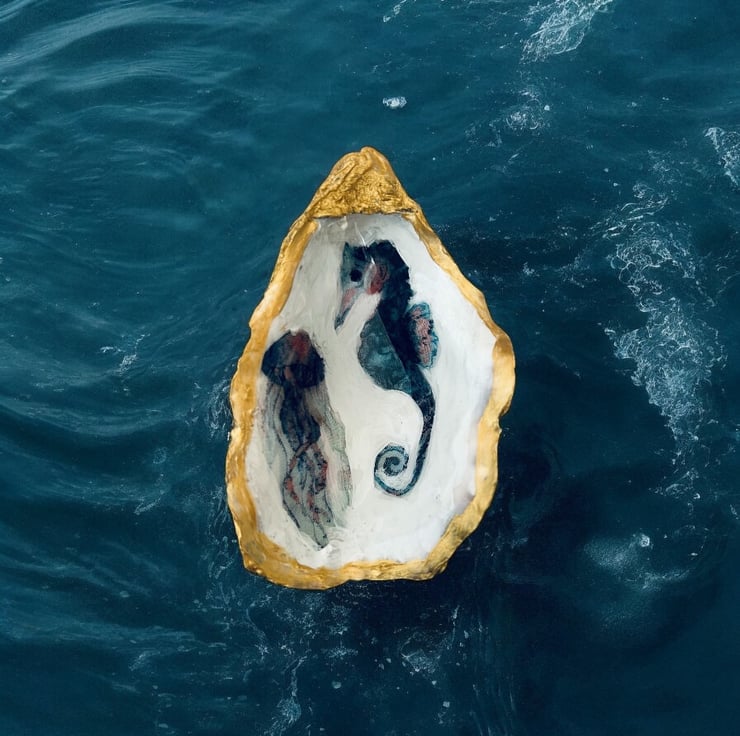 Seahorse and jellyfish Oyster Shell Decoupage - Large Deep Trinket Dish - 11cm in length and approx 3.5-4cm depth. Each shell is hand made therefore the size may vary from slightly smaller to slightly bigger but all roughly 10 - 12cm in length and depth is between 3.5 - 4.5.