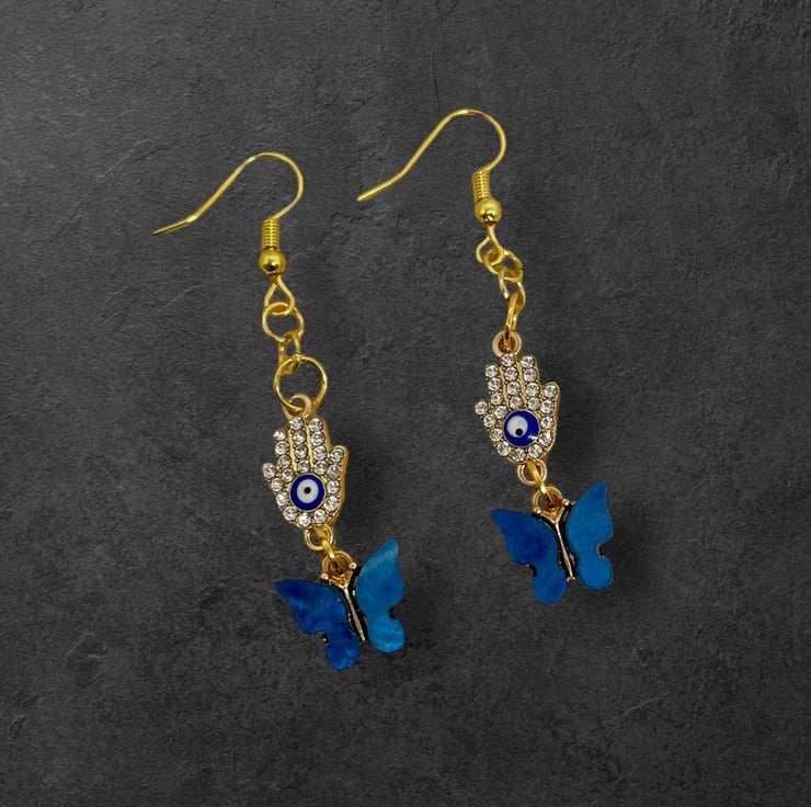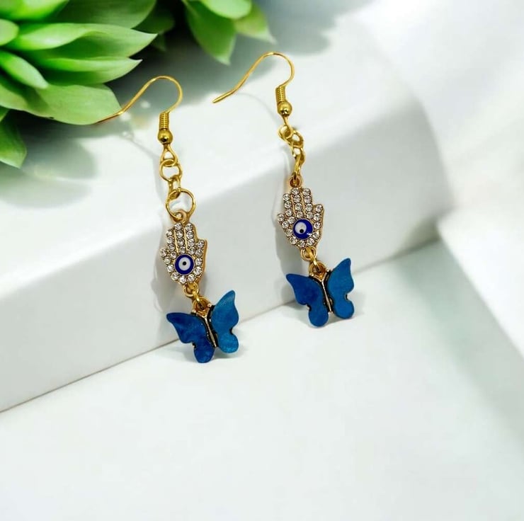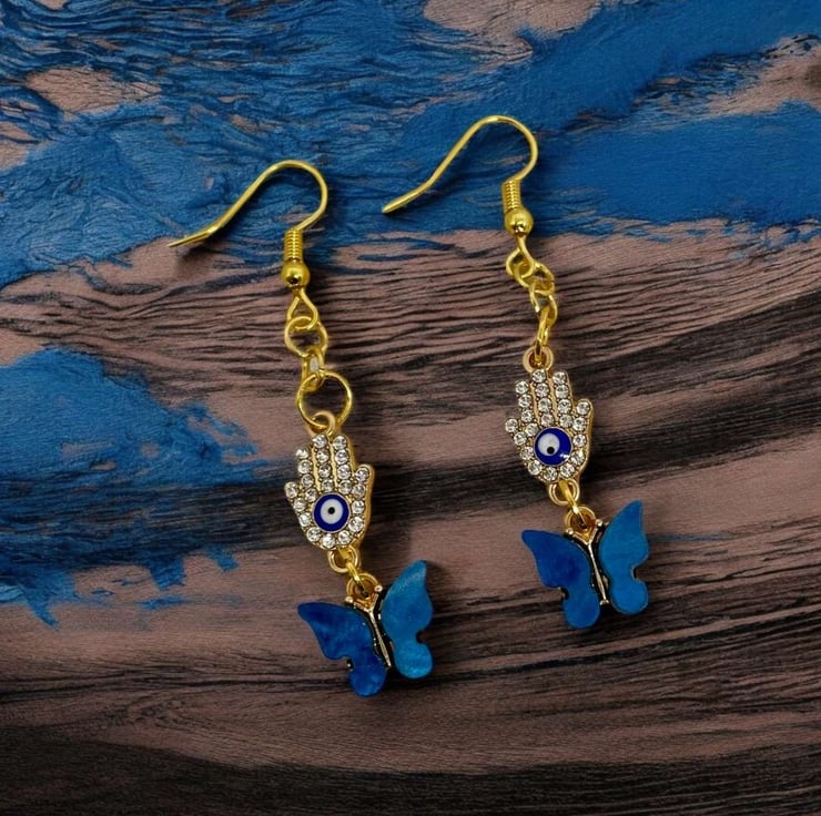 These "Butterfly Guardian Earrings" feature delicate, gold-tone chains. In the middle showcases a Hamsa hand (symbol of protection) with a vibrant blue centre. The bottom features a matching blue butterfly. Lightweight and eye-catching!