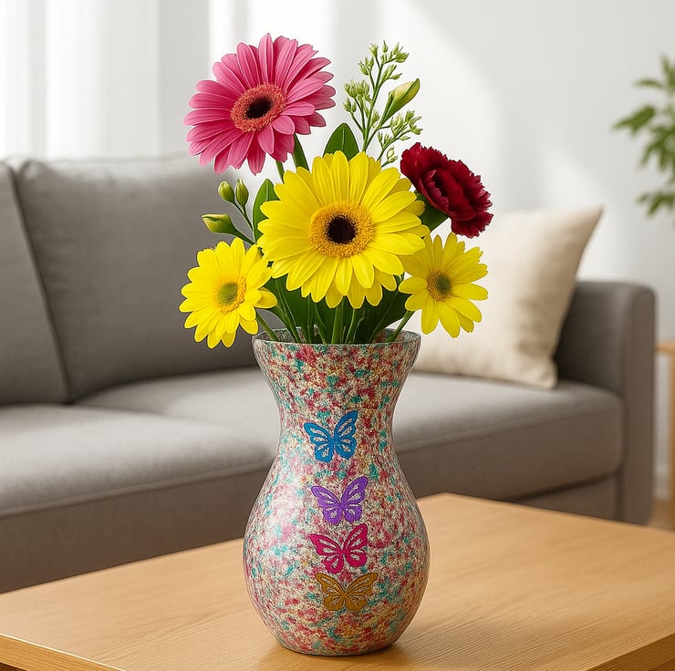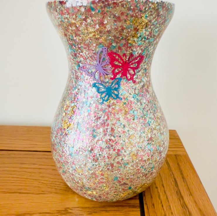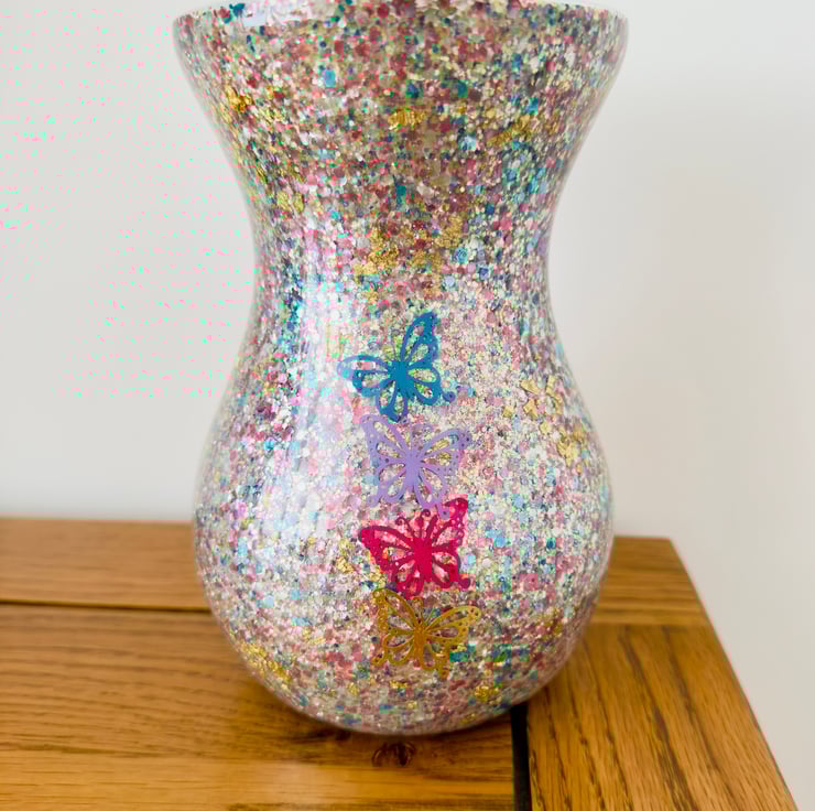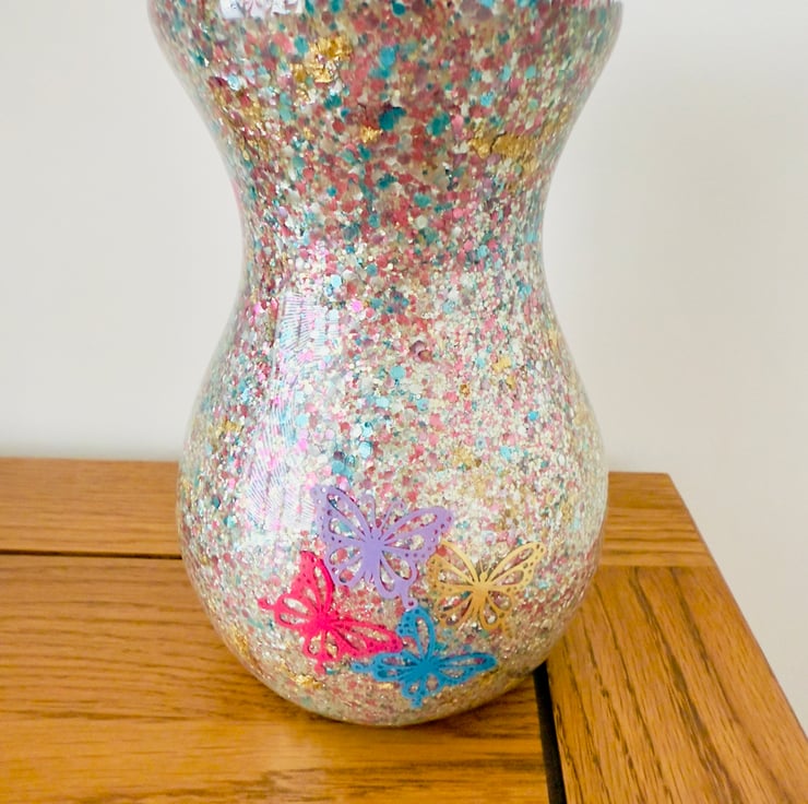 Abstract Resin-Glass Vase with Glitter and Butterflies
