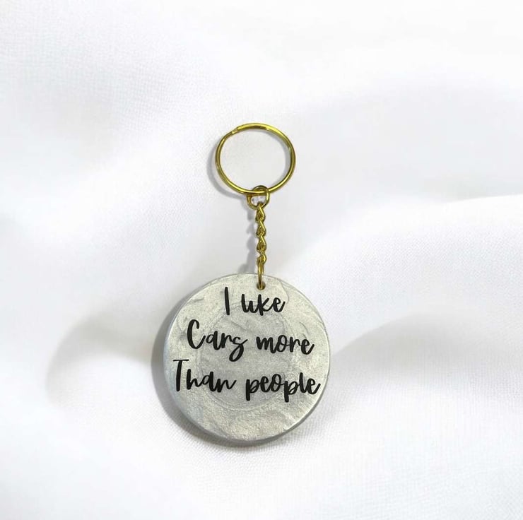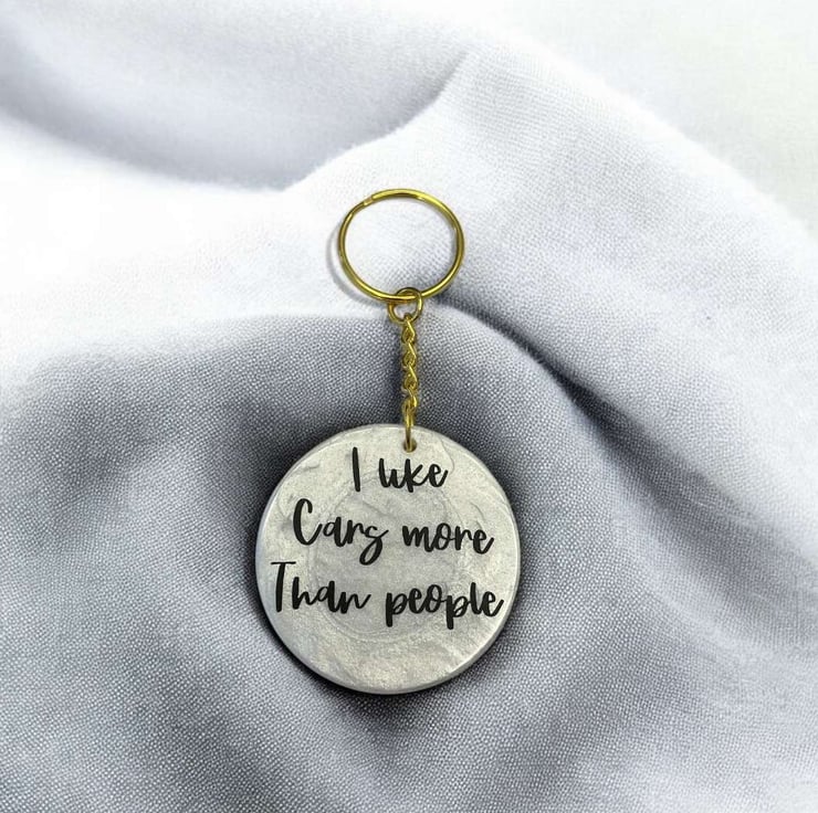 This keychain features a round, silver pendant with the text "I like Cars more Than people" in black cursive. It's attached to a gold-colored metal ring and chain. Perfect for car enthusiasts with a sense of humor!