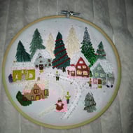 Small hoop embroidered with Christmas stockings hanging from a holly branch.