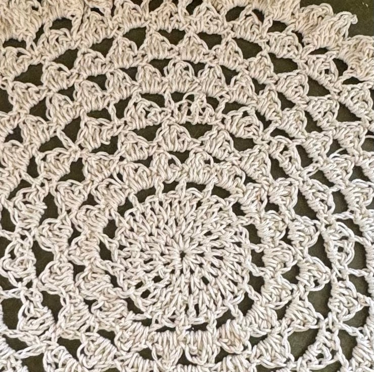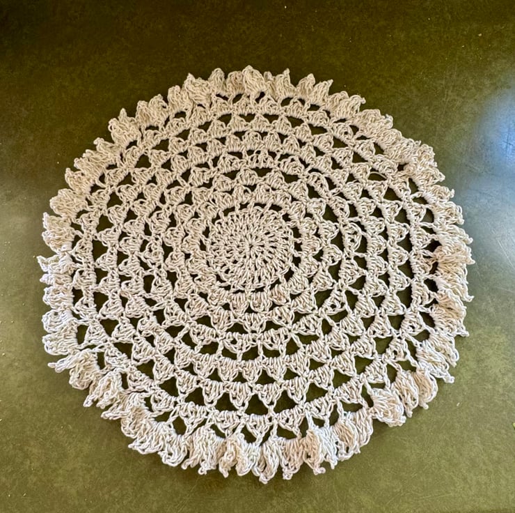 The large round place mat has been crocheted by hand in rounds of petal shapes and finished with a shaggy, petal trim to give texture to the piece.
