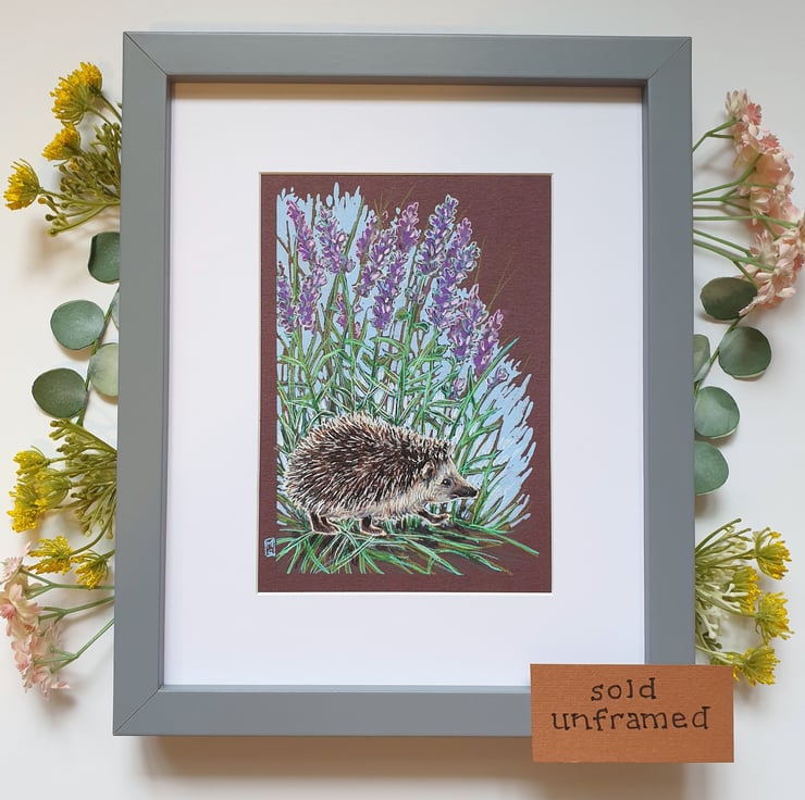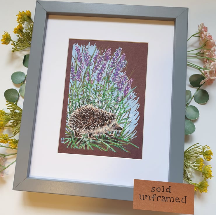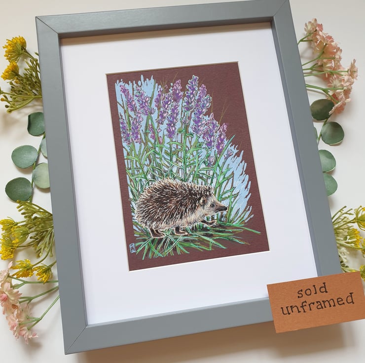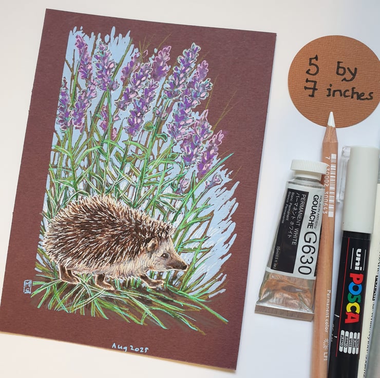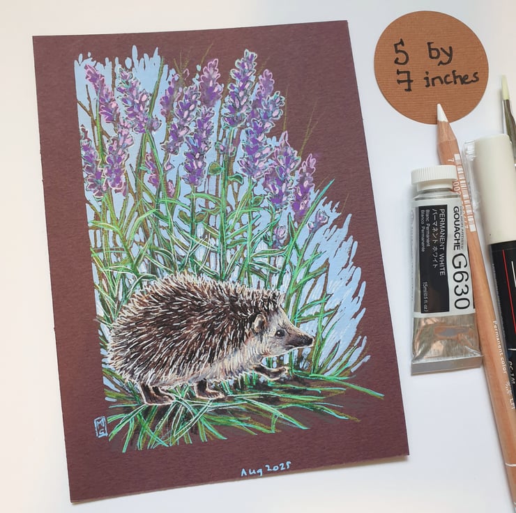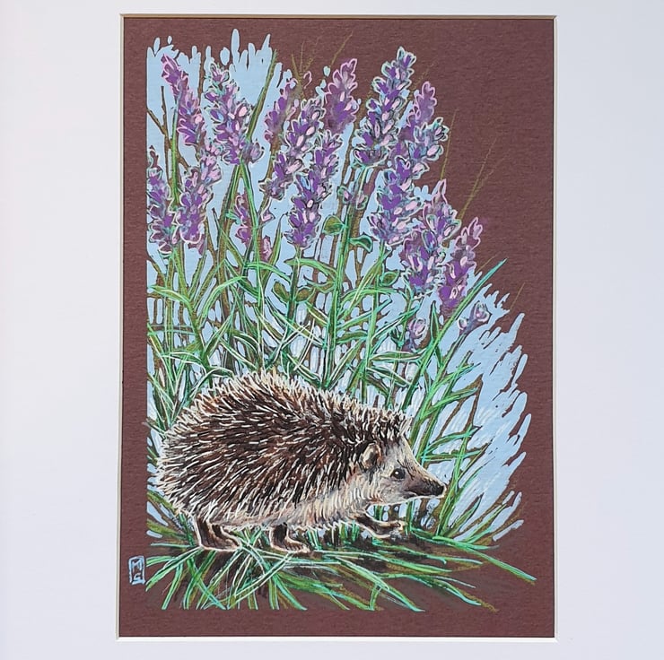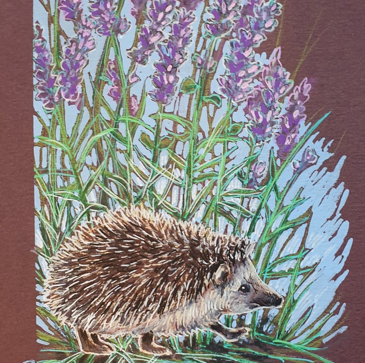 A small drawing of a cute little hedgehog in profile walking through a patch of purple lavender flowers. The drawing is on dark red brown paper.