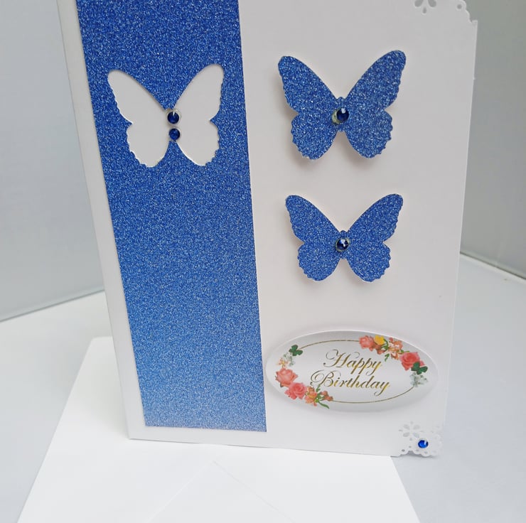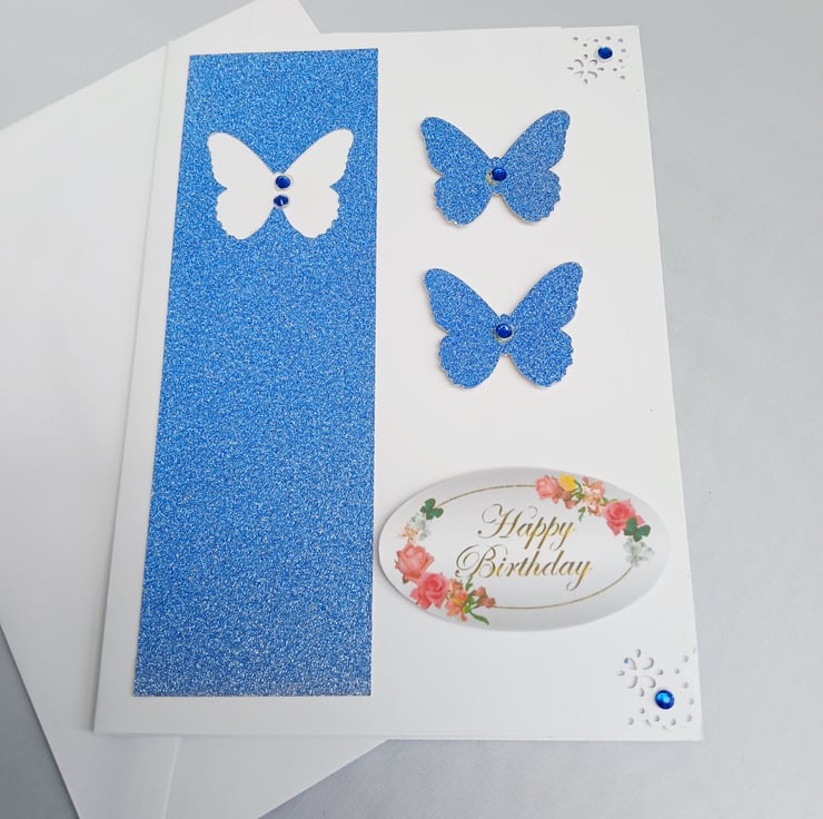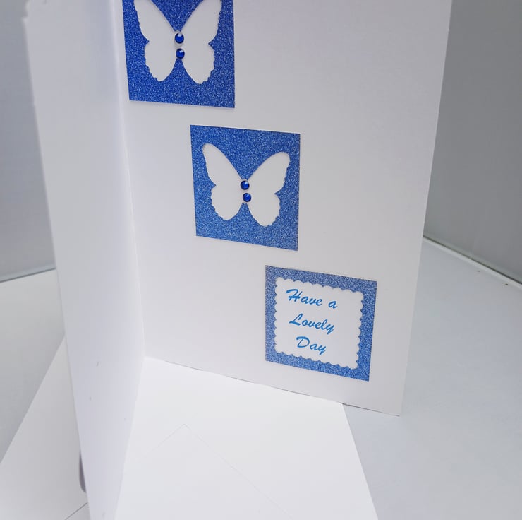Happy Birthday Card with Glitter Butterflies. This card measures 5" x 7" and has an accompanying envelope. The blue strip and butterflies are cut from blue glitter card and embellished with blue diamantes with 'Happy Birthday' sentiment. The corners have a nice cut out feature embellished with diamante on the corners. Inside is matching blue glitter card with cut out butterflies embellished with diamantes and a sentiment of 'Have a lovely day' This card will be sent in a cardboard envelope