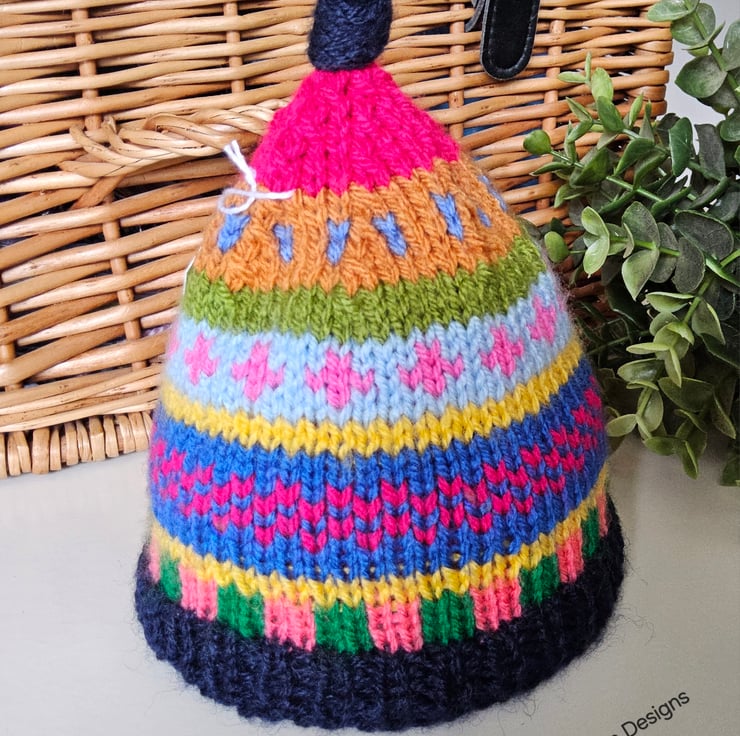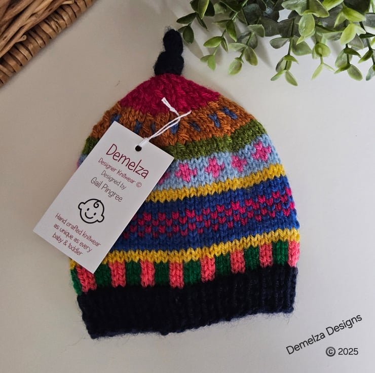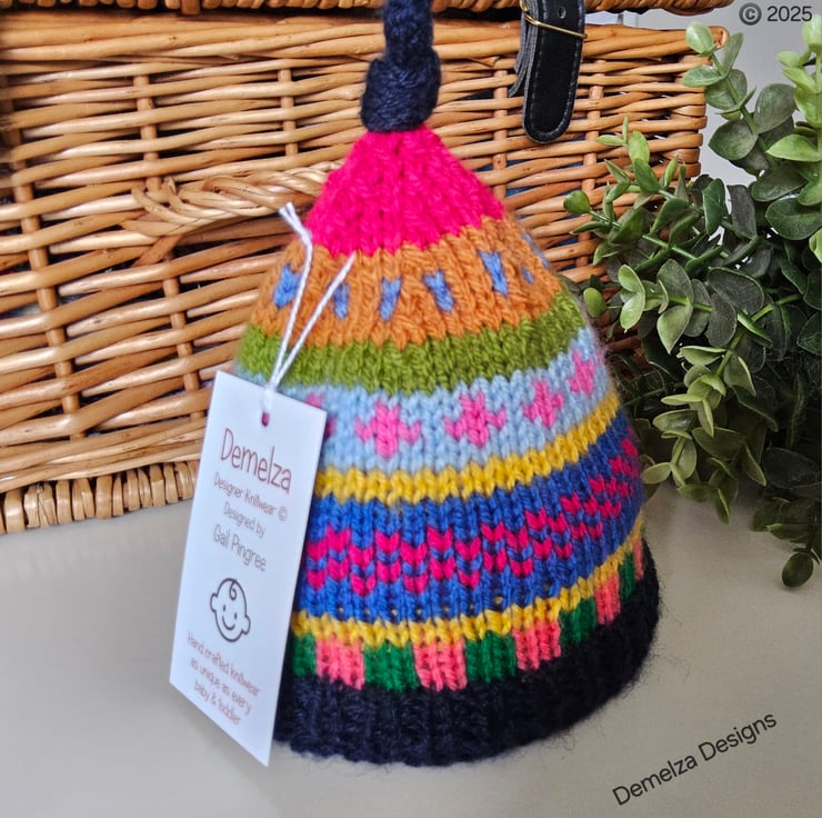 A unique eye catching baby fairisle knotted pixie hat has been designed and lovingly hand crafted in Cornwall. The yarns used are premium machine washable acrylic. This adorable little hat will make a perfect token gift for any mother and baby to receive.